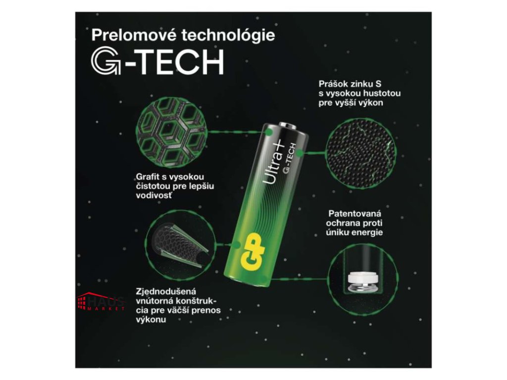 chemické zloženie: alkalické|hmotnosť: 24 g|kapacita: neuvádza sa|kategória/rada: Ultra Plus Alkaline|max. skladovateľnosť: 10 rokov|možnosť nabíjania: nie|napätie: 1,5 V|počet nabíjacích cyklov: nenabíjacie|predajný obal: 4 ks, papierová krabička|prevádzková teplota: -20 °C až +54 °C|rozmer: 14,5 × 50,5 mm|typové označenie: LR6 (tužka, AA)|veľkosť batérie: AA|značka: GPDodatočné parametre