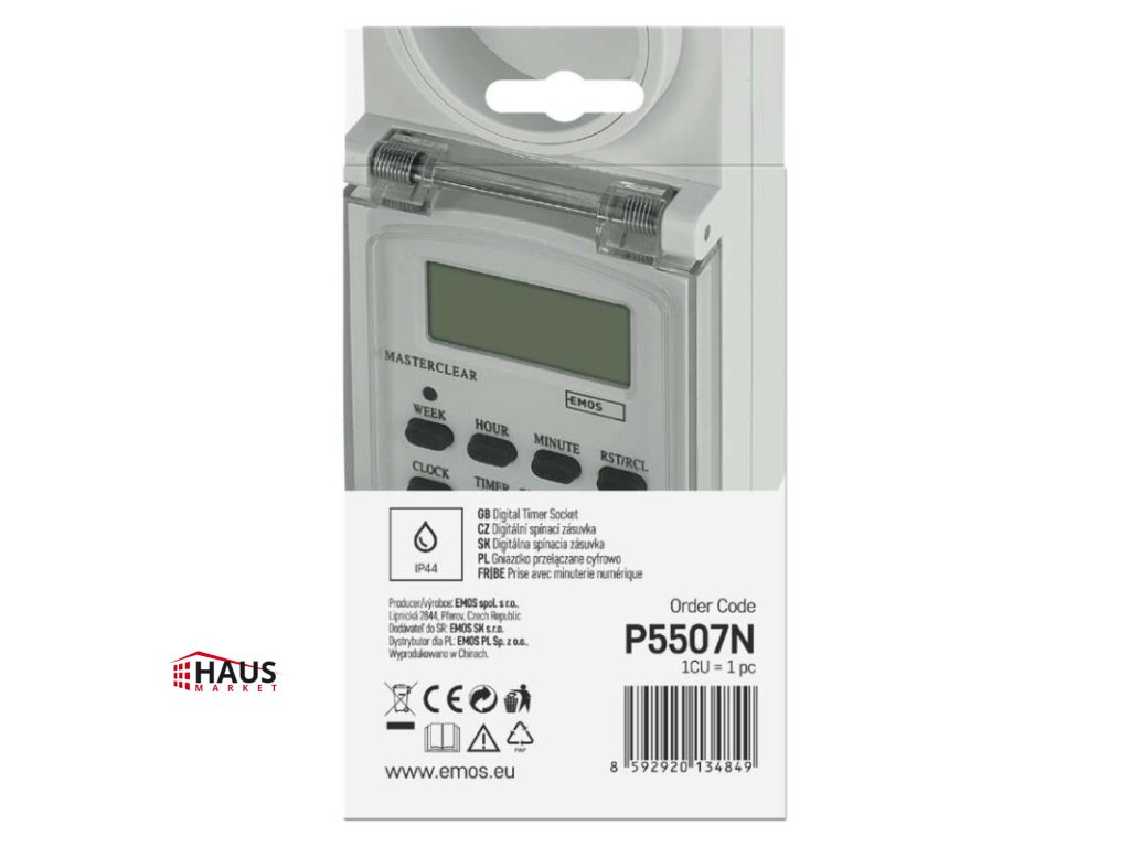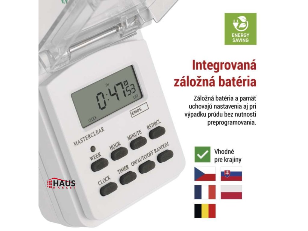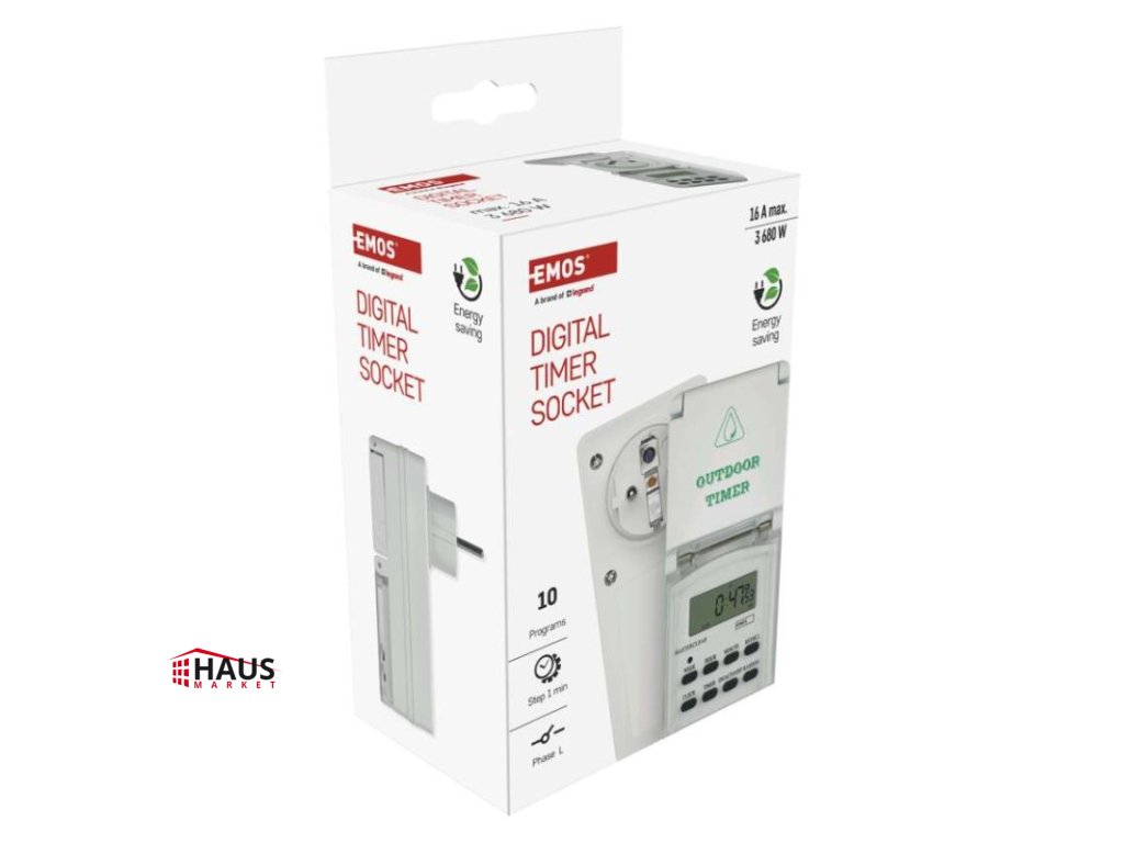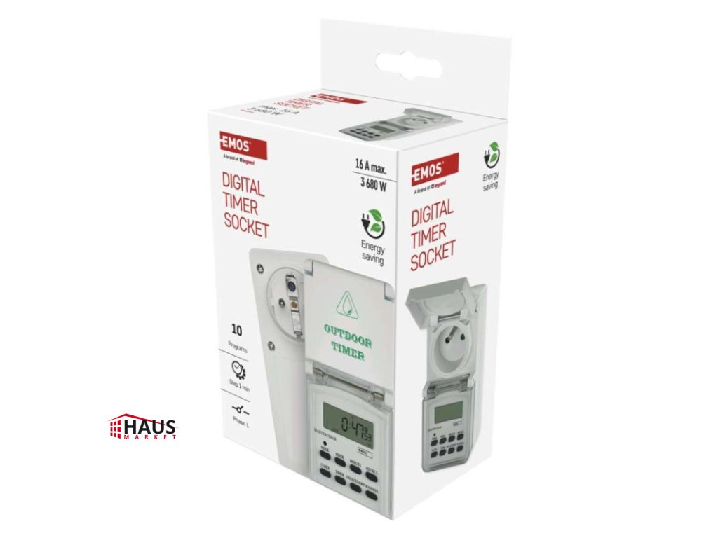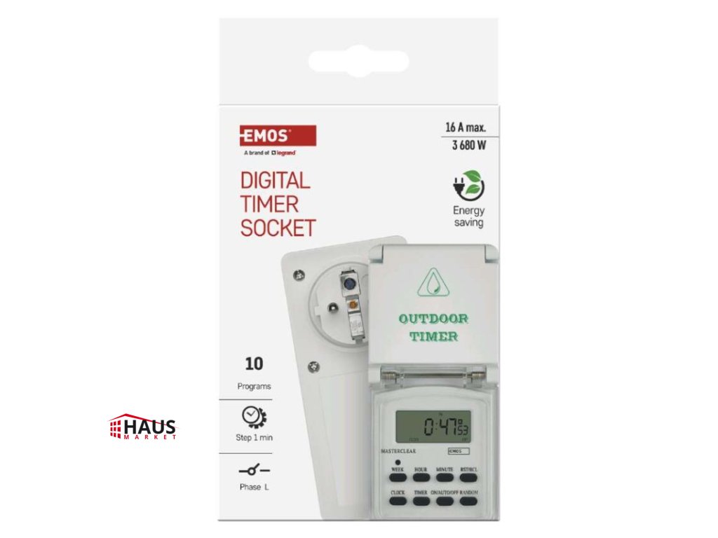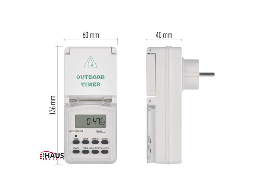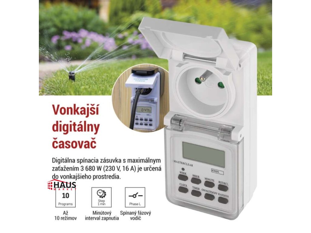 detské clonky: áno|druh: digitálna|funkcia odpočítavania countdown: nie|funkcia zmeny letný/zimný čas: áno|krytie: IP44|max. záťaž: 3 680 W|minimálna doba zopnutia: 1 minúta|možnosť ručného zapnutia: áno|napätie/prúd: 230 V~/16(2) A max.|počet programov: 10|počet spínaní za deň: 10|predajný obal: 1 ks, krabica|rozmer: 60 × 80 × 136 mm|spína: fázový vodič|vonkajšie použitie: áno|záložný akumulátor: 1,2 V; 40 mAh; NiMH (gombíková batéria 1× 1,2 V)Dodatočné parametre