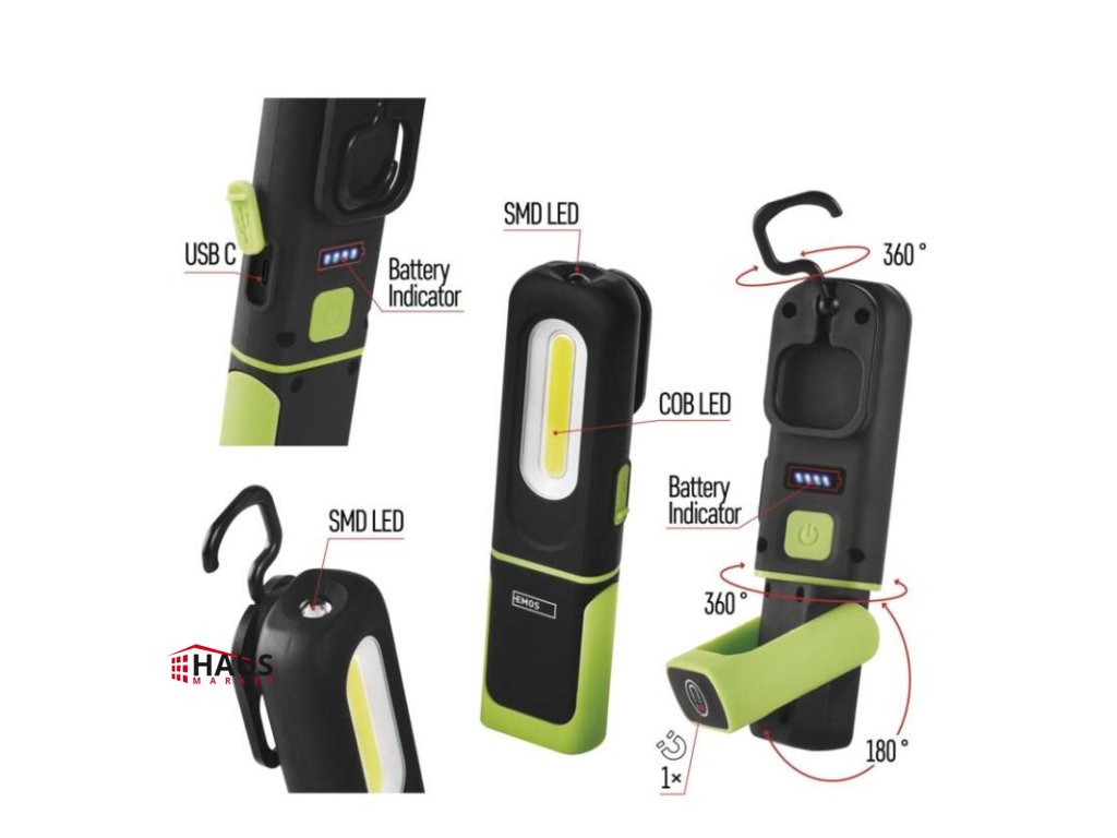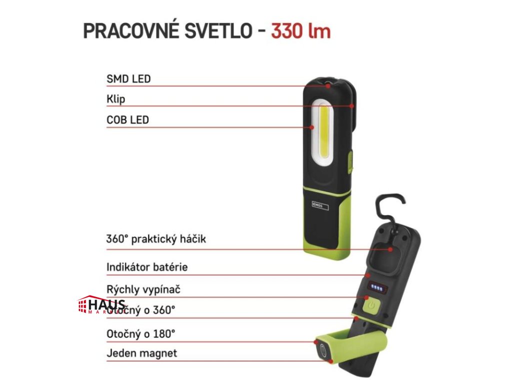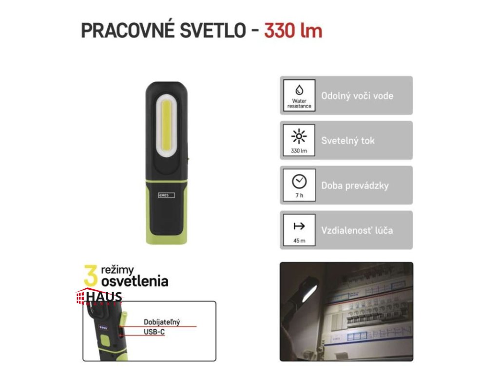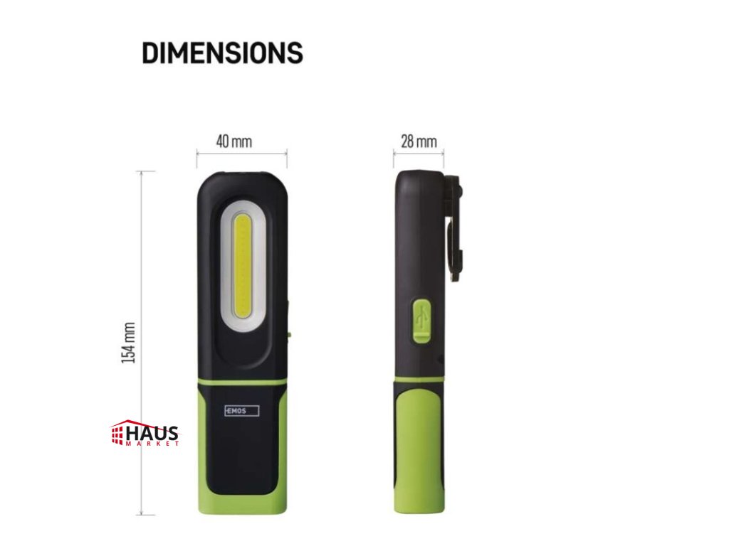 batérie súčasťou balenia: áno|doba nabíjania: 2–4 h|doba svietenia: 3–7 h|doba svietenia detail: COB LED 100 % – 3 h, COB LED 33 % – 5,5 h, SMD LED 100 % – 7 h|dosvit: COB LED 100 % – 25 m, COB LED 33 % – 15 m, SMD LED 100 % – 45 m|farba: zeleno-čierná|fokus: nie|hmotnosť: 110 g|LED indikácia nabíjania: áno|LED indikácia stavu akumulátora: áno|materiál: ABS plast + guma|maximálny dosvit: 45 m|maximálny svetelný tok: 330 lm|nabíjací: áno|napájanie: Li-Ion|nárazuvzdornosť: áno|počet režimov svietenia: 3|predajný obal: 1 ks, krabica|príslušenstvo: USB kábel|režimy: COB LED 100 %, COB LED 33 %, SMD LED 100 %|rozmer: 41 × 29 × 154 mm|špeciálna funkcia: funkcia rýchleho vypnutia, funkcia ochrany batérie|svetelný tok: COB LED 100 % – 330 lm, COB LED 33 % – 100 lm, SMD LED 100 % – 60 lm|typ batérie: 1 200 mAh/3,7 V|typ napájacieho konektoru: USB C|vodeodolná: áno (IP43)|vybavenie: otočná naklápacie rukoväť, 1× klip, 1× magnet, 1× hák|záručná doba: 2 roky|zdroj svetla: COB LED + SMD LED|značka: EMOSDodatočné parametre