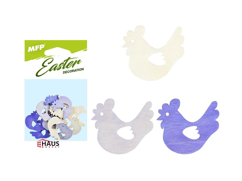 Veľkonočná dekorácia sliepka drevená, vyrezávaná. Ozdobte si byt touto krásnou dekoráciou. Dekoráciu môžete použiť k aranžovaniu vencov a rôznych doplnkov do interiéru. BALENIE OBSAHUJE: -12 sliepočiek (žlté, fialové, sivé) Dodávame vo vrecku so závesom. Uvedená cena je za 1 balenie.Dodatočné parametre