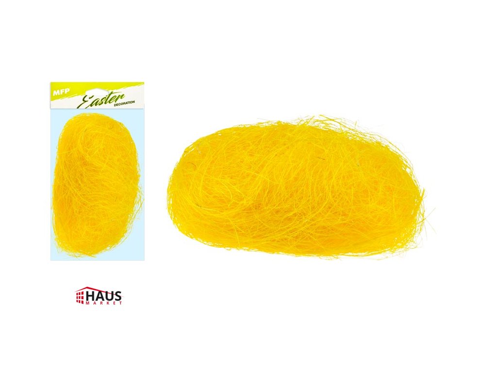 Dekoračná žltá tráva zo sisalu. POUŽITIE: Tento sisal je vhodný na dekorovanie košíkov, kvetináčov, vencov a na aranžovanie veľkonočnej výzdoby. Hmotnosť balenia: 20 g Uvedená cena je za 1 ks. Dodávame vo vreckovom balení.Dodatočné parametre