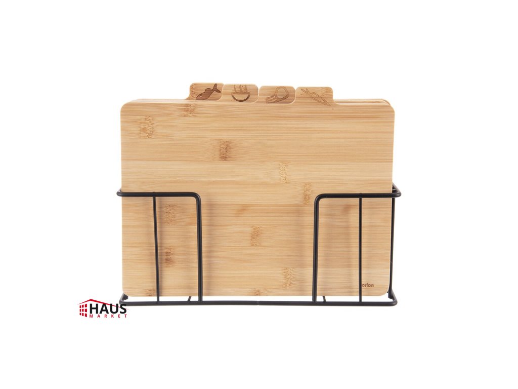Obojstranné dosky na krájanie sú vyrobené z prírodného ekologického materiálu. Sada 4 dosiek v stojane. Každá doštička má štítok s obrázkom, vďaka ktorému môžete rozlíšiť, na čo doštičku používate – je výhodné mať pri varení dosky rozdelené na krájanie zeleniny, surového mäsa, tepelne upravených pokrmov a rýb. Všetky 4 dosky pohodlne uložíte do stojana a môžete ich mať na kuchynskej linke vždy po ruke. Materiál: bambus, kov s čiernym nástrekom. Nedá sa umývať v umývačke riadu. Rozmery: 29x7x22,5 cm, jedna doska 28x20,3/22x1 cm.Dodatočné parametre