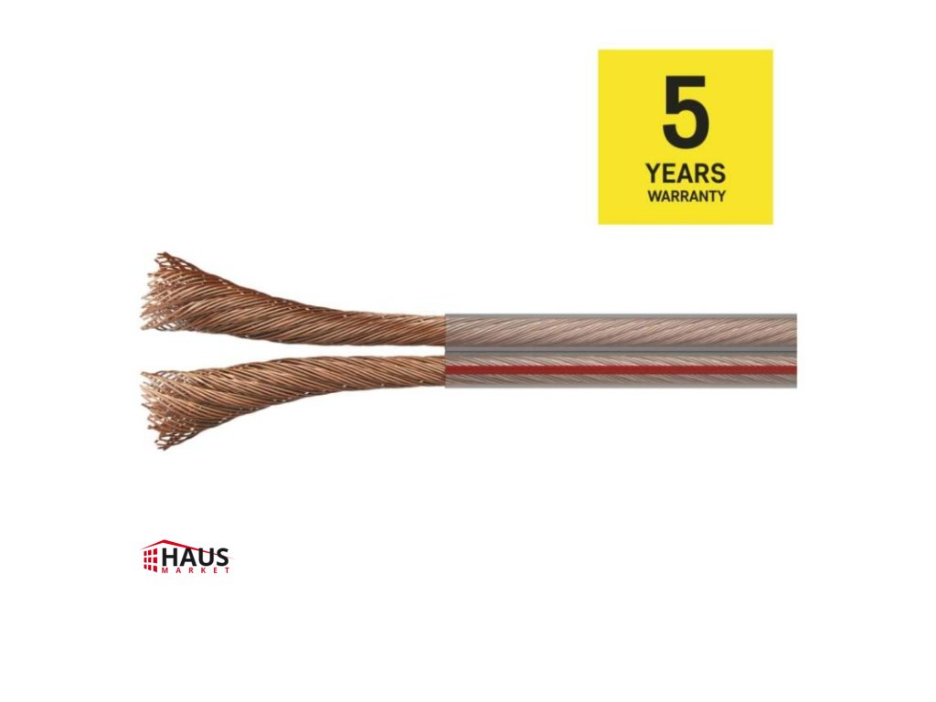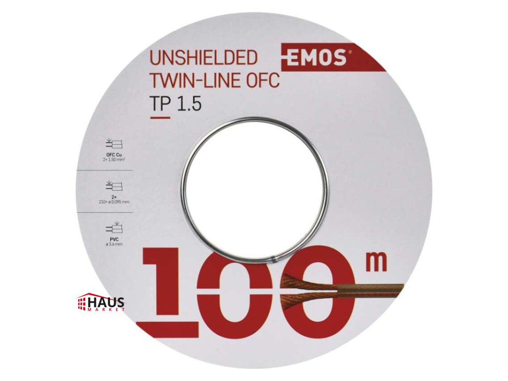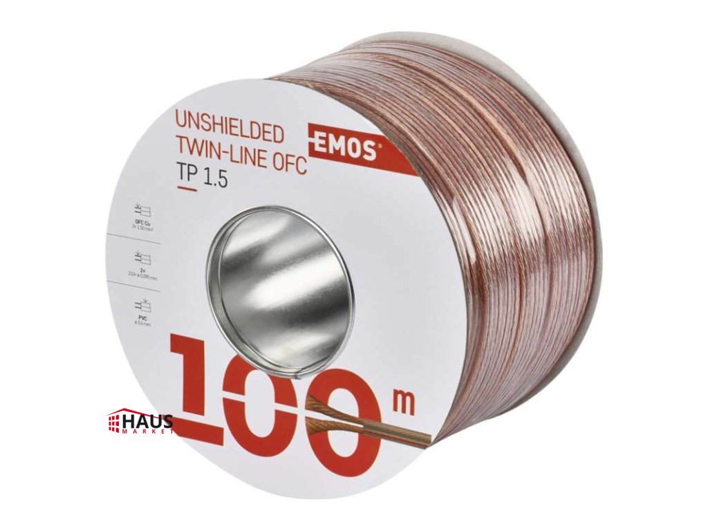 dvojitá izolácia: nie|farba izolácie vnútorných vodičov: nie je|farba plášťa: priehľadná, priehľadná|materiál plášťa: PVC|materiál vnútorného vodiča: OFC meď (Cu)|materiál vodičov tienenia: nie je|maximálne prevádzkové napätie: 50 V|počet drôtikov tienenia: nie je|predajný obal: 100 m, cievka|predpokladané použitie: prepojenie reproduktorov|priemer vnútorného vodiča: 210× 0,095 mm|prierez drôtikov tienenia: nie je|prierez vodiča: 1,5 mm²|spôsob balenia - dĺžka: 100 m|tienenie: nie|typové označenie: SP150/TP|vonkajšia izolácia: 2× 3,6 mm|záručná doba: 5 rokovDodatočné parametre