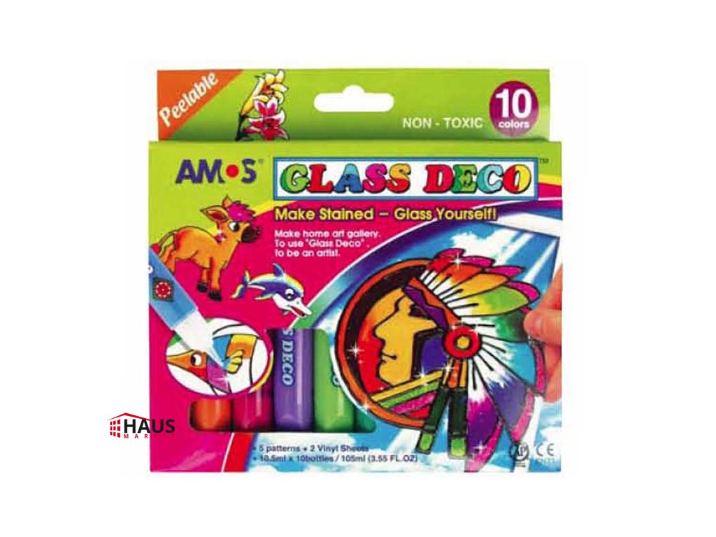 Farby na sklo 10 farieb 10,5 ml + šablóny a fólie. NAZDOBTE SI SKLO PODĽA VLASTNEJ FANTÁZIE! S farbičkami na sklo je umelec každý! Vytvor si vlastnú kúzelnú výzdobu! Vhodné na okno, zrkadlo, dlaždice, ai. Farby sú netoxické. BALENIE OBSAHUJE: - 9 ks farieb na sklo 10,5 ml (žltá, oranžová, ružová, fialová, tmavo zelená, svetlo zelená, modrá, hnedá, biela) - 1 ks čierne kontúry 10,5 ml - 5 ks predlôh na papieri - 2 ks fólií na maľovanie NÁVOD: 1. Priložte fóliu na šablónu. 2. Obkreslite kontúrou obrys šablóny a nechajte 1-2 hodiny schnúť. 3. Potom vyfarbite obrázok a nechajte 24 hodín schnúť. 4. Opatrne ho zlúpnite z fólie a umiestnite na zvolený povrch. Dodávame v papierovej krabičke. Uvedená cena je za 1 balenie.Dodatočné parametre
