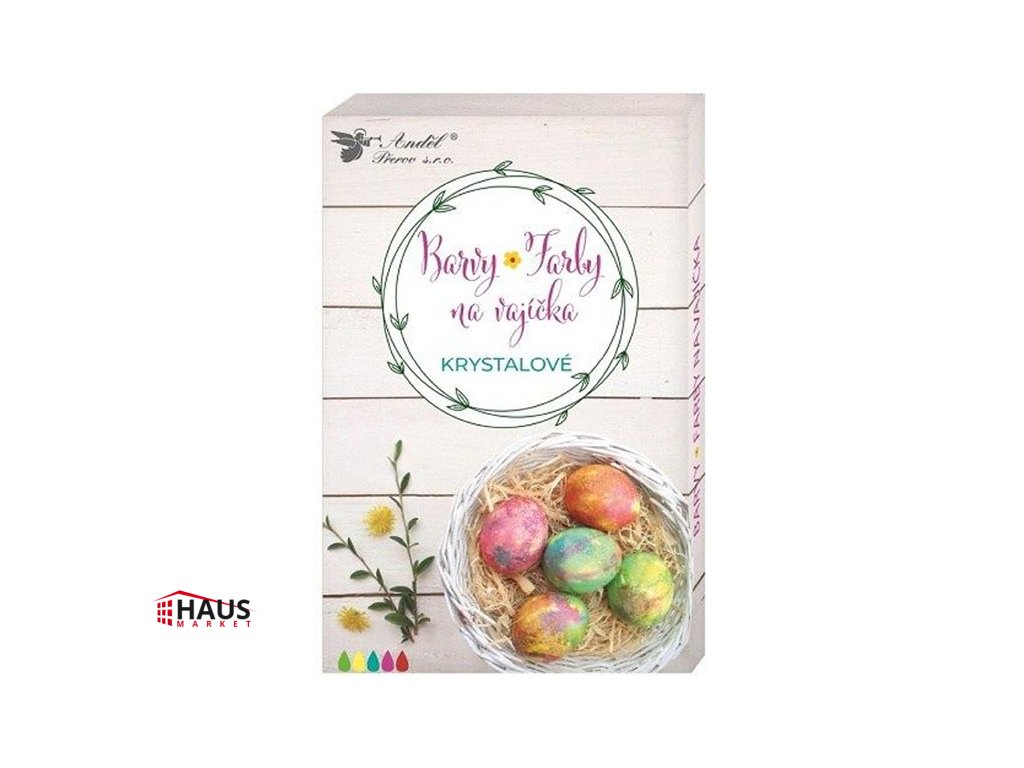 Barvy na vajíčka krystalové v tabletách. OBSAH BALENÍ: - 5 ks barev v tabletách - krystaly (3g) - rukavice NÁVOD: 1. Do vhodné širší nádoby (hrnce) vložte vedle sebe 10 umytých vajec. 2. Zalijte je studenou vodou smíchanou s krystaly.Nechte 15 minut povařit. 3. Vejce nechejte vychladnout stále ponořené ve vodě s krystaly. 4. Tablety pomocí nůžek rozbalte, požadovanou barvu vložte do misky, zalijte 150 ml horké vody a přidejte 2-3 lžíce octa. 5. Vejce jedno po druhém namáčejte nebo jen lžící přelévejte, dokud nebude mít požadovanou barvu. Jedna tableta nabarví 4 - 5 vajíček. Uvedená cena je za 1 balení.Dodatočné parametre