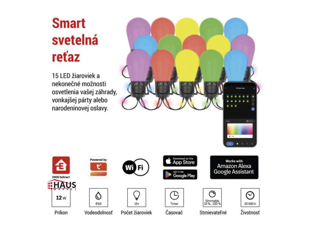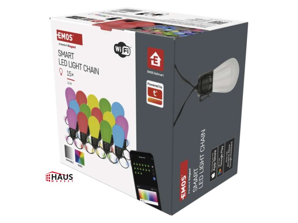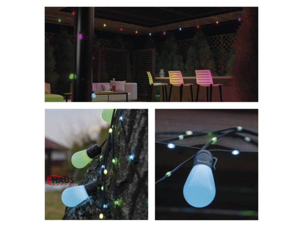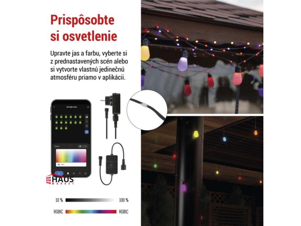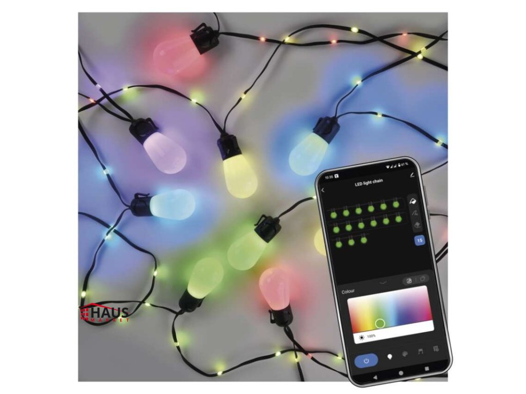 GoSmart LED svetelný reťazec – 15× párty žiarovky, 15 m, vonkajšie aj vnútorné, RGBIC WiFi