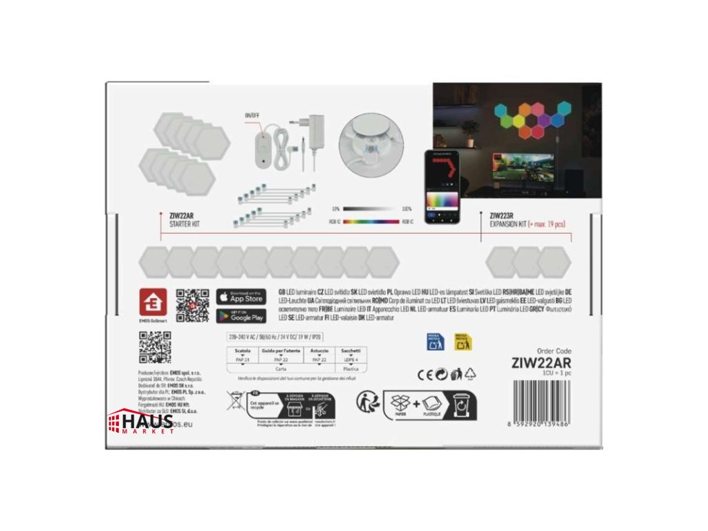 dĺžka: –|dĺžka prívodu: 1,5 m|energetická trieda dodávaného svetelného zdroja: –|farba svetla: RGBIC|farba tela: biela|jazyky aplikácie: EN, CZ, SK, PL, DE, HU, SI, FR, + 60 ďalších jazykov|kategória: –|kompatibilita: EMOS GoSmart, Tuya, Lidl, Smartlife|krytie: IP20|materiál difúzora: plast|materiál tela: plast|maximálny počet segmentov: 19|nastavenia farieb (RGB): áno|nastavenie teploty farieb: nie|notifikácie do mobilnej aplikácie: áno|ovládanie hlasovými asistentmi: áno (Amazon, Alexa, Google Assistant)|počet segmentov: 10|počet spínacích cyklov: –|podporované OS: iOS, Android|predajný obal: 1 ks, krabička|prenosová frekvencia: 2,4 GHz (IEEE 802.11b/g/n)|príkon: 19 W|protokol: WIFI + BLE|rada: GoSmart|RGB digital: áno|šírka: –|stmievanie: áno|svetelná účinnosť: –|svetelný tok: –|svetelný zdroj je súčasťou balenia: –|technológia: LED|teplota chromatičnosti: –|tvar: #|vstupné napätie: 220–240 V~/50 Hz|výška: –|záručná doba: 2 roky|životnosť: 20 000 hodínDodatočné parametre