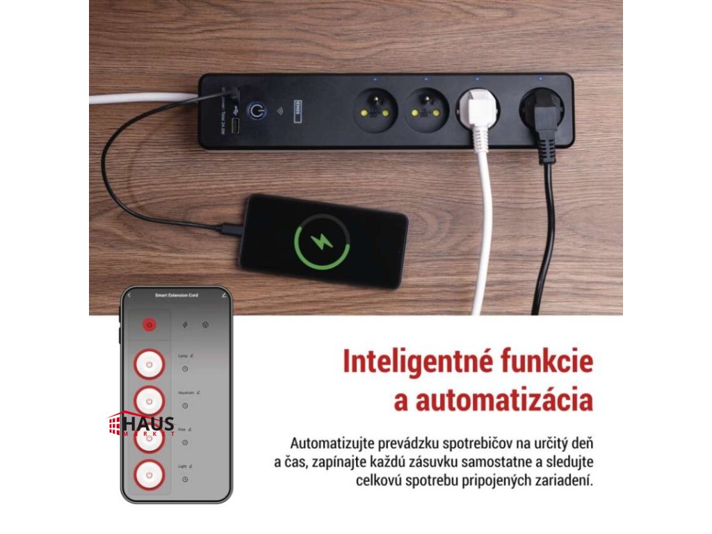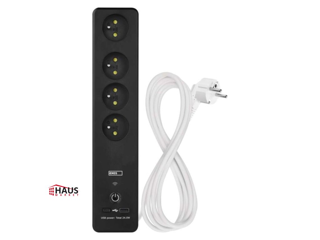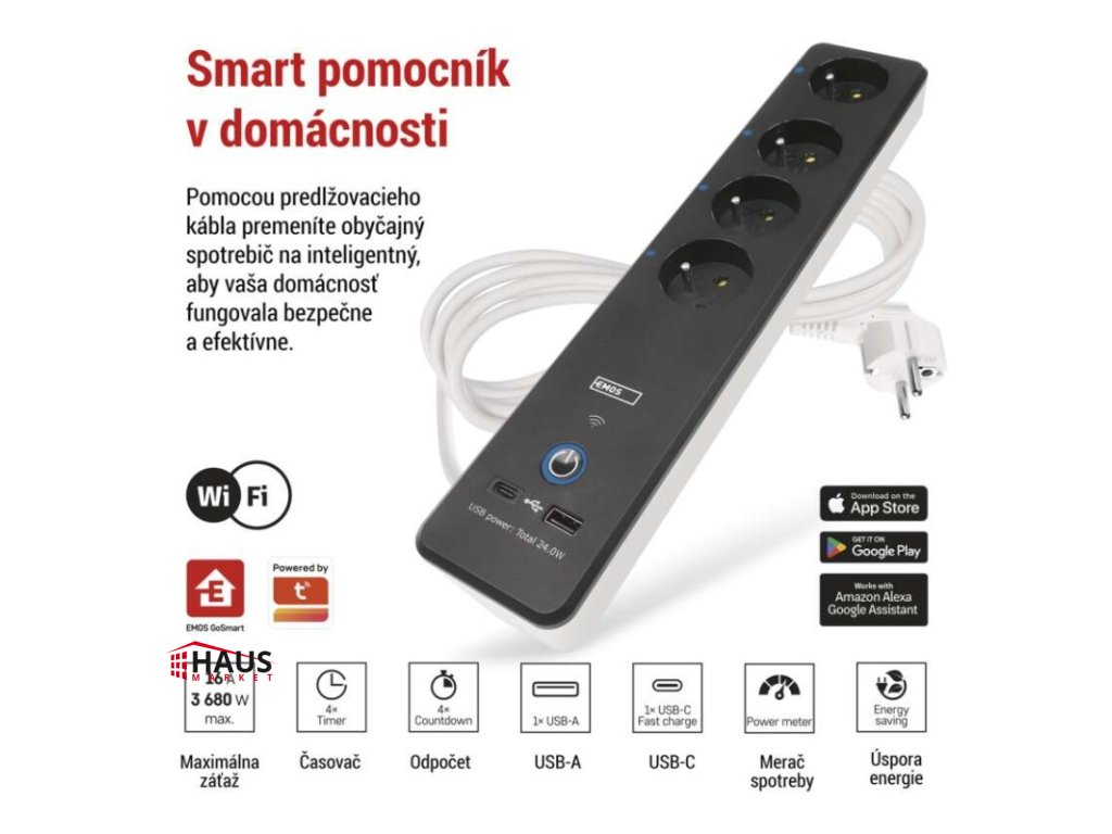 ďalšie funkcie: merač spotreby energie, časovač, funkcia odpočítavania|detské clonky: áno|dĺžka: 2 m|farba: biela/čierna|jazyky aplikácie: EN, CZ, SK, PL, DE, HU, SI, FR, + 60 ďalších jazykov|kompatibilita: EMOS GoSmart, TUYA, LIDL, Smartlife, otvorený systém|krytie: IP20|materiál zásuvky a vidlice: plast|max. záťaž: 3 680 W|napätie: 250 V~|notifikácie do mobilnej aplikácie: áno|ovládanie hlasovými asistentmi: áno (Amazon Alexa, Google Assistant)|počet zásuviek: 4× 2P + PE|podporované OS: Android, iOS|predajný obal: 1 ks, krabica|prenosová frekvencia: 2,4 GHz WIFI (IEEE802.11b/g/n)|prierez vodiča: 1,5 mm²|protokol: Wi-Fi|prúd: 16 A max.|typ izolácie: PVC|USB výstup: 1× USB-A 2,1 A, 1× USB-C 3 A (QC 2.0) total: 24 W|vodič: H05VV-F3G|vypínač: ánoDodatočné parametre