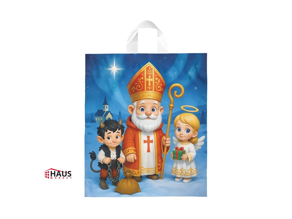 Ideálny spoločník na vaše nákupy! Igelitová nákupná taška s mikulášskym motívom je ideálnou voľbou na predvianočné nákupy. Veselá zimná ilustrácia s Mikulášom, anjelikom a čertíkom dodá každému nákupu sviatočnú náladu. Vďaka pevnému materiálu, praktickým uchám a rozmerom je taška dostatočne priestranná aj na väčší nákup. Skvelá kombinácia funkčnosti a vianočnej atmosféry. Hrúbka igelitu: 0,050 mm Rozmer: 400 x 460 x 80 mm Uvedená cena je za 1 ks.Dodatočné parametre