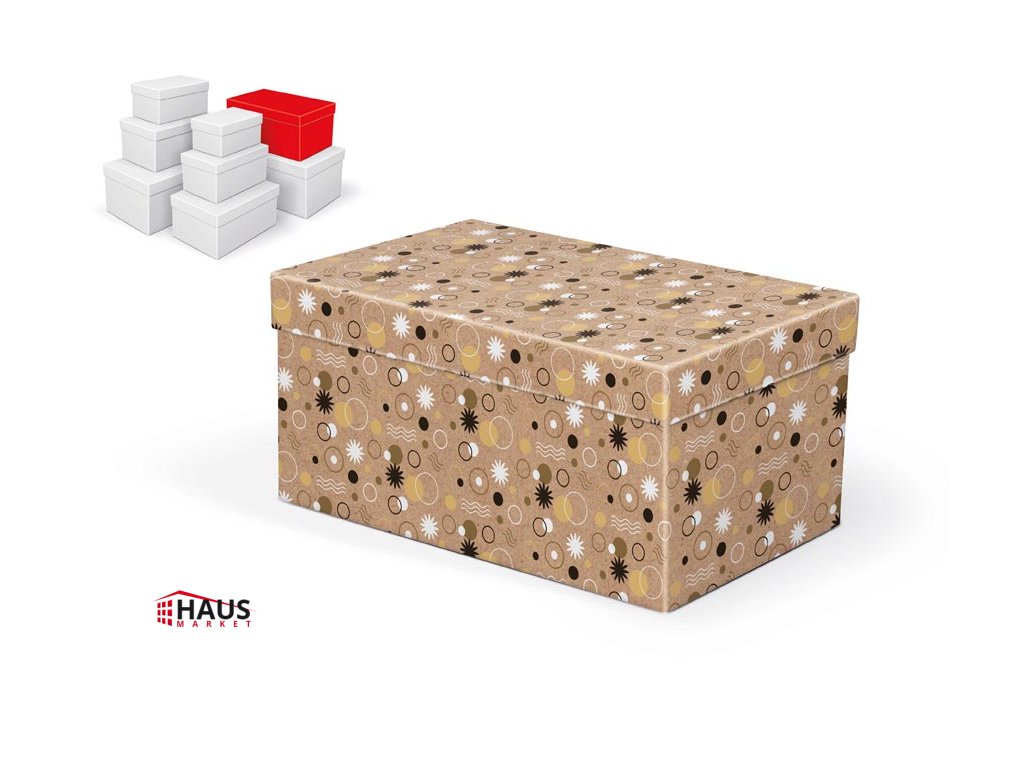 Celoročná darčeková krabica s rozmermi 26 x 17 x 13 cm NÁHODNÝ MIX Táto darčeková krabička v prírodnom štýle zaujme hravým mixom vzorov – od kvetinových tvarov cez hviezdičky až po jemné krúžky a línie. Všetko ladené do teplých tónov hnedej, béžovej, bielej a horčicovej vytvára zaujímavý, ale harmonický celok, ktorý pôsobí vkusne a zároveň originálne. Pridaním jednej krabičky do košíka získate rovno celú sadu. Každá má iný motív a veľkosť, ale všetky spolu ladia tónom aj štýlom. Využijete ich na darčeky, spomienky aj ako štýlový doplnok domácnosti. Materiál: 1,5 mm kartón, potiahnutý papierom s potlačou Set obsahuje tieto krabice: 5371265 Škatuľa darčeková B-C011-A 16x10x8 cm 5371266 Škatuľa darčeková B-C011-B 18x11x9 cm 5371267 Škatuľa darčeková B-C011-C 20x12x10 cm 5371268 Krabica darčeková B-C011-D 22x14x11 cm 5371269 Krabica darčeková B-C011-E 24x16x12 cm 5371270 Škatuľa darčeková B-C011-F 26x17x13 cm 5371271 Krabica darčeková B-C011-G 28x18x14 cm 5371272 Krabica darčeková B-C011-H 30x19x15 cm Uvedená cena je za 1 ks.Dodatočné parametre
