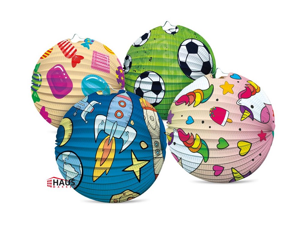 Papierový okrúhly lampión v mixe motívov. Vhodná dekorácia na párty, lampiónový sprievod, záhradná slávnosť, karneval, oslavu narodenín alebo len tak na zavesenie do detskej izbičky. Vyberte si svoj lampión a urobte z bežného večera kúzelný. Lampión je bez prútika a svetielka. Lampión má pútko na zavesenie. Materiál: papier, kov Priemer lampiónu: 25 cm Motívy: raketa, jednorožec, futbal, cukríky Dodávame v mixe po 4 ks podľa skladovej zásoby. Uvedená cena je za 1 ks.Dodatočné parametre