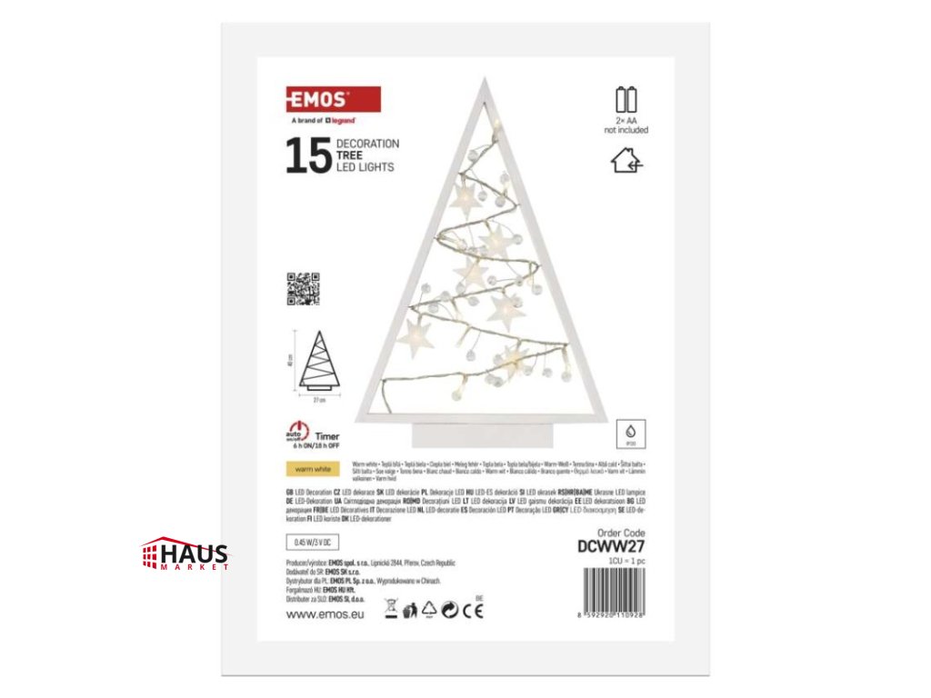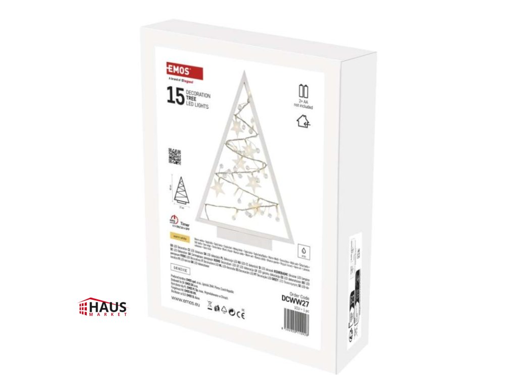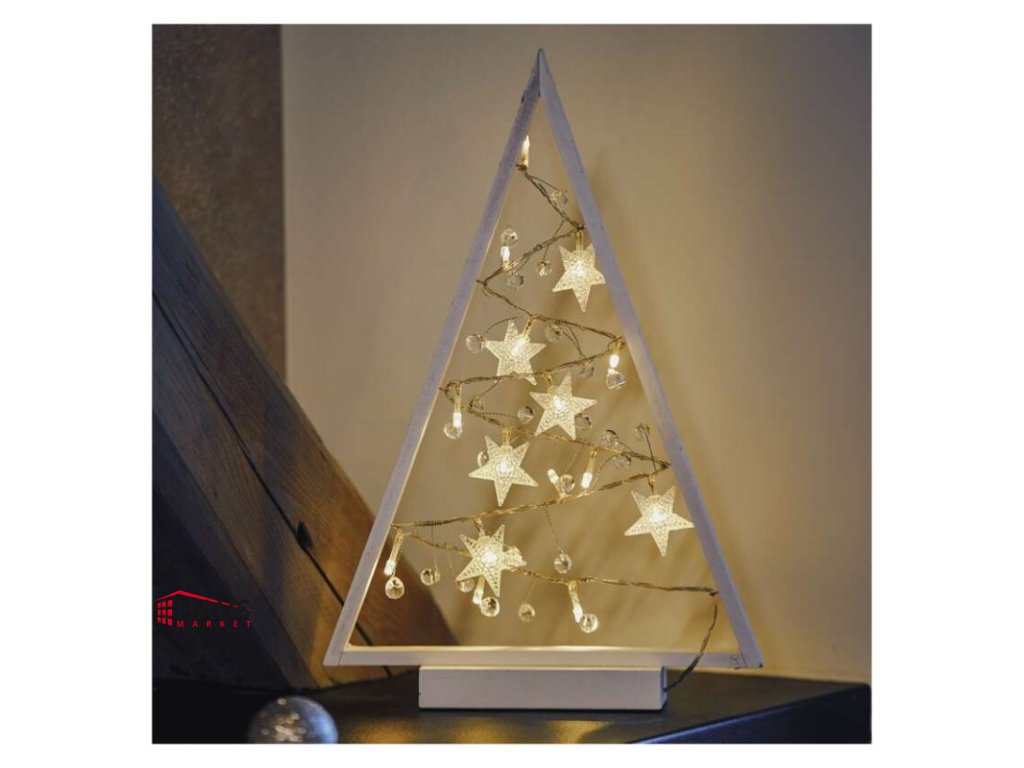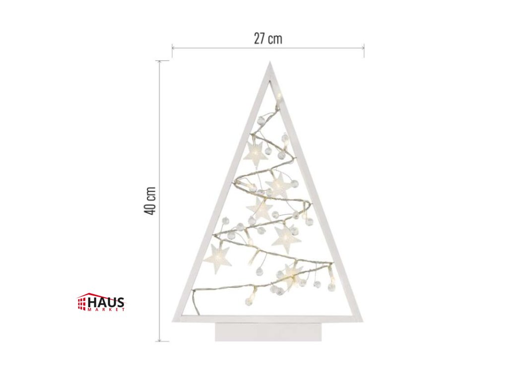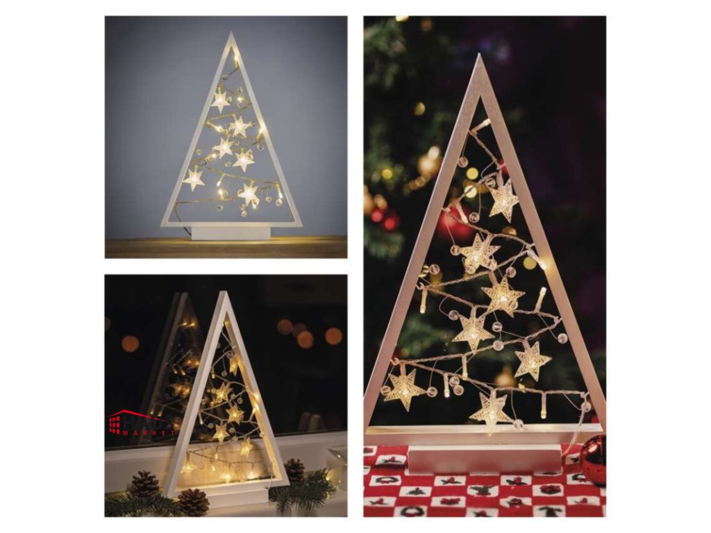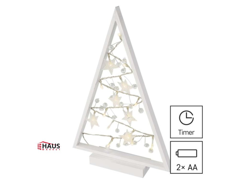 časovač: áno|diaľkový ovládač: nie|dĺžka prívodu: neuvádza sa|farba drôtu: neuvádza sa|farba svetla: teplá biela|krytie: IP20|materiál: drevo|počet LED: 15|použitie: vnútorné|predajný obal: 1 ks, krabica|príkon: 0,45 W|produkt: stromček|rozmer: 27 × 40 × 5 cm|typ napájania: batéria 2× AA (nie je súčasťou balenia)|vstupné napätie: neuvádza sa|výstupné napätie: 3 V DC|záručná doba: 2 roky|zdroj svetla: LED|životnosť: 10 000 hodínDodatočné parametre