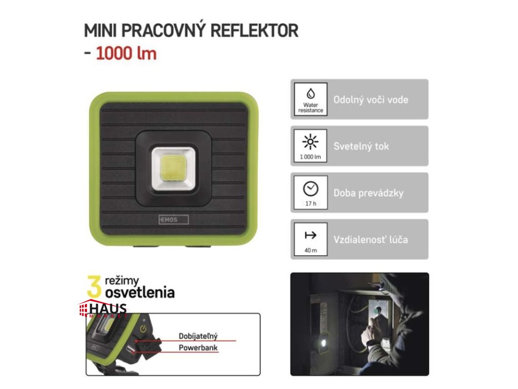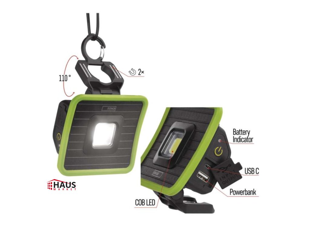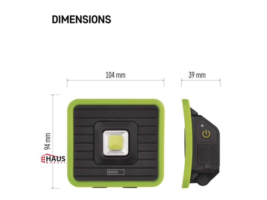 batérie súčasťou balenia: áno|doba nabíjania: 3 h|doba svietenia: 3–17 h|doba svietenia detail: COB LED 100 % – 3 h, COB LED 50 % – 6 h, COB LED 25 % – 17 h|dosvit: COB LED 100 % – 40 m, COB LED 50 % – 30 m, COB LED 25 % – 20 m|farba: čierno-zelená|fokus: nie|hmotnosť: neuvádza sa|LED indikácia nabíjania: áno|LED indikácia stavu akumulátora: nie|materiál: ABS plast|maximálny dosvit: 40 m|maximálny svetelný tok: 1 000 lm|nabíjací: áno|napájanie: Li-Ion|nárazuvzdornosť: áno|počet režimov svietenia: 3|predajný obal: 1 ks, krabica|príslušenstvo: USB-C kábel|režimy: COB LED 100 %, COB LED 50 %, COB LED 25 %|rozmer: 104 × 39 × 94 mm|špeciálna funkcia: funkcie powerbank, funkcia rýchleho vypnutia, funkcia ochrany batérie|svetelný tok: COB LED 100 % – 1 000 lm, COB LED 50 % – 500 lm, COB LED 25 % – 250 lm|typ batérie: 2 200 mAh/3,7 V|typ napájacieho konektoru: USB C|vodeodolná: áno (IP44)|vybavenie: magnet, stojanček, klip|záručná doba: 2 roky|zdroj svetla: COB LED|značka: EMOSDodatočné parametre