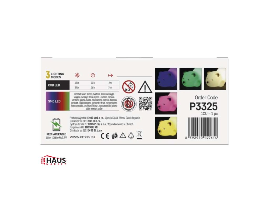 automatické zapnutie/vypnutie: áno|časové oneskorenie: 30 minút|farba svetla: teplá biela/multicolor|fotosenzor: nie|maximálny dosvit: 3 m|maximálny svetelný tok: 20 lm|max. výstup 1× USB: –|max. výstup celkom: –|napájanie: Li-Ion batéria 3,7 V/1 200 mAh|natáčanie: –|ochrana proti preťaženiu, prepätiu a skratu: –|počet USB výstupov: –|pohybové čidlo: nie|predajný obal: 1 ks, krabica|príkon: –|režimy: SMD LED 50 %, SMD LED 100 %, SMD LED multicolor|rozmer: 155 × 85 × 69 mm|vypínač: áno|zdroj svetla: SMD LEDDodatočné parametre
