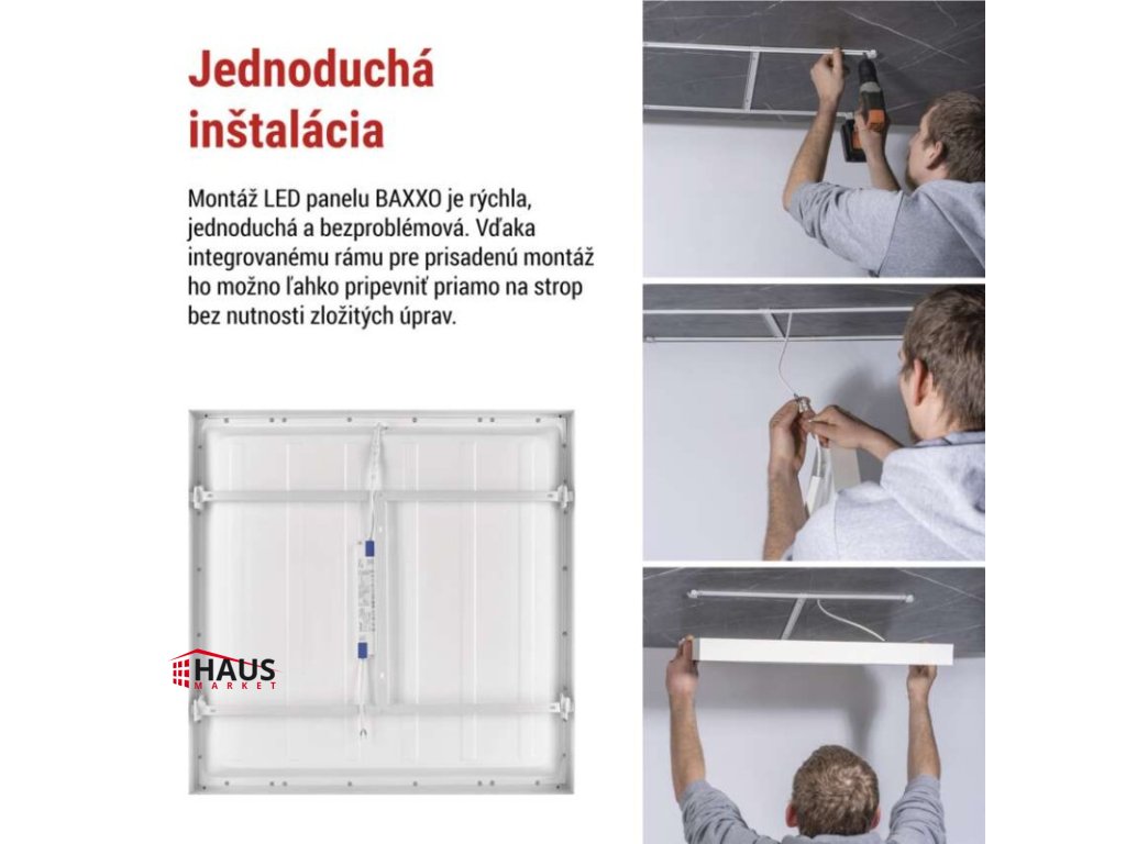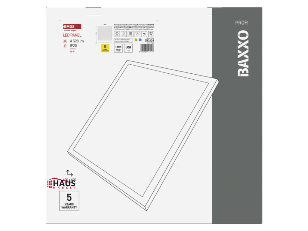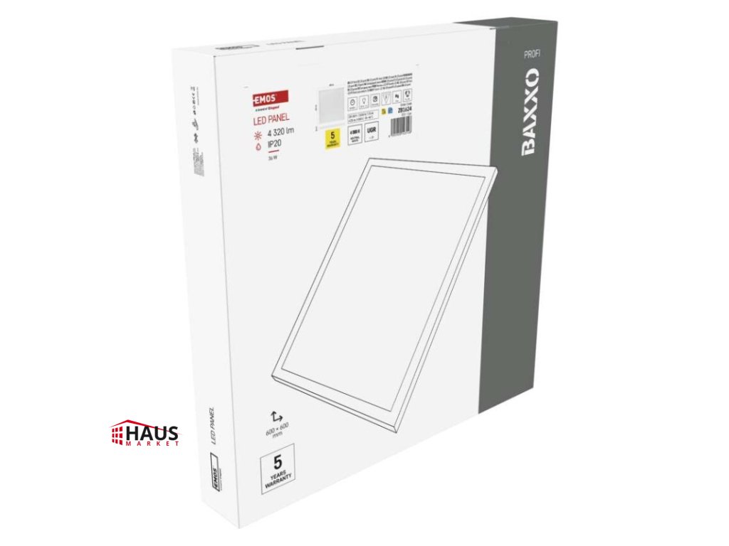 ďalšie funkcie: –|diaľkový ovládač: nie|do chodby a na schodisko: áno|do dielne a garáže: nie|do kancelárie: áno|do kuchyne: áno|do kúpeľne: nie|do obývačky, spálne a detskej izby: áno|dosah senzora: nemá senzor|do záhrady a na balkón: nie|farba svetla: neutrálna biela|farba tela: biela|flicker-free: áno|frekvencia: 50/60 Hz|index podania farieb (CRI): Ra > 80|jazyky aplikácie: –|kategória: PROFI|kompatibilita: –|krytie: IP20|materiál difúzora: plast (PS)|materiál LGP: neuvádza sa|materiál tela: oceľový plech|montážny otvor: neuvádza sa|možnosť stmievania: nie|náhrada za žiarovku: 4× 18 W CFL|napätie: 220–240 V~|notifikácie do mobilnej aplikácie: nie|obsah balenia: –|ovládanie hlasovými asistentmi: nie|podporované OS: –|pohybový senzor: nie|predajný obal: 1 ks, krabica|prenosová frekvencia: –|príkon: 36 W|protokol: –|prúd: 170 mA|rada: BAXXO|rozmer: 600 × 600 × 50 mm|spôsob montáže: prisadené|svetelná účinnosť: 120 lm/W|svetelný tok: 4 320 lm|teplota chromatičnosti: 4 000 K|tvar: štvorec|typ difúzora: mliečny|typ svietidla: panel|účinník: > 0,9|UGR<: 22|uhol vyžarovania: 120°|umiestnenie: stropné/nástenné|výstupný prúd zo zdroja: 950 mA|záručná doba: 5 rokov|zdroj svetla: LED|životnosť: 50 000 hodínDodatočné parametre