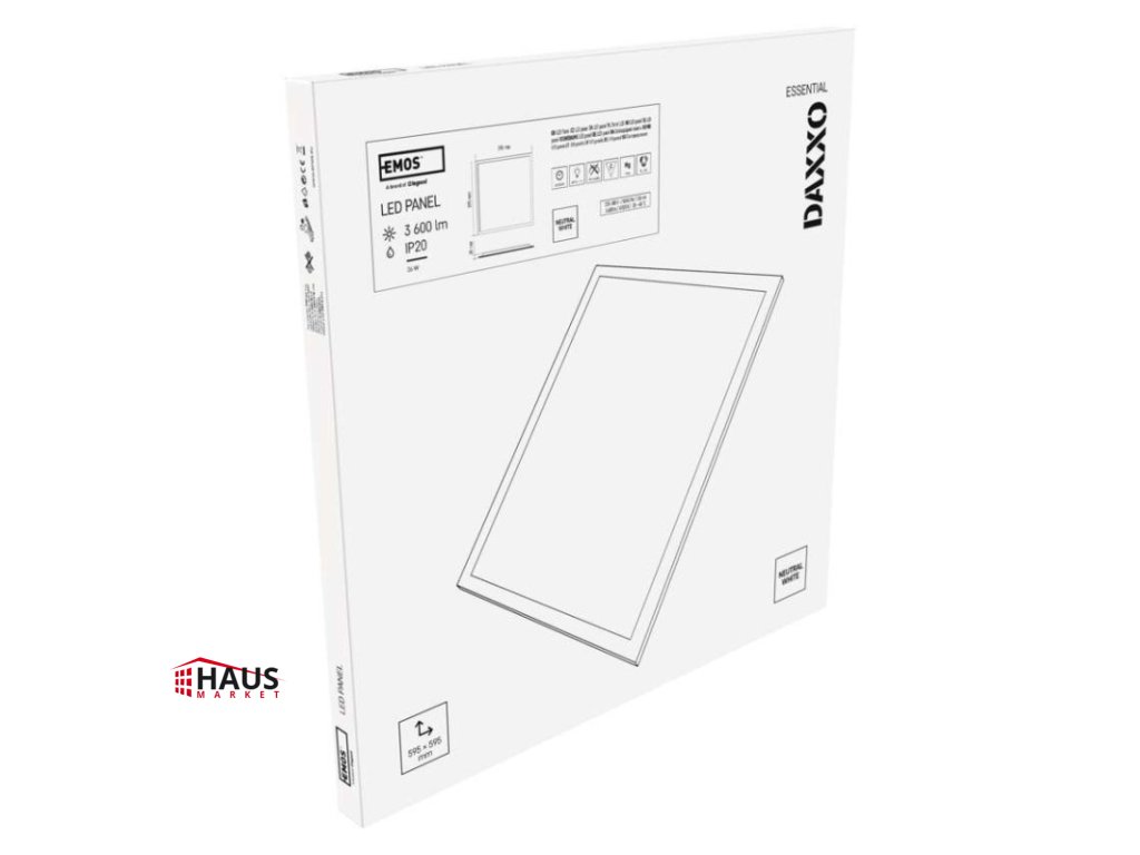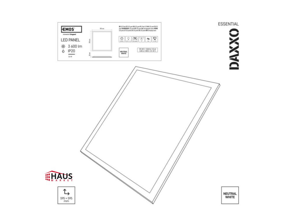 ďalšie funkcie: –|diaľkový ovládač: nie|do chodby a na schodisko: nie|do dielne a garáže: nie|do kancelárie: áno|do kuchyne: nie|do kúpeľne: nie|do obývačky, spálne a detskej izby: nie|dosah senzora: –|do záhrady a na balkón: nie|farba svetla: neutrálna biela|farba tela: biela|flicker-free: áno|frekvencia: 50/60 Hz|index podania farieb (CRI): Ra > 80|jazyky aplikácie: –|kategória: ESSENTIAL|kompatibilita: –|krytie: IP20|materiál difúzora: plast (PC)|materiál LGP: –|materiál tela: oceľový plech|montážny otvor: –|možnosť stmievania: nie|náhrada za žiarovku: 4× 18 W CFL|napätie: 220–240 V|notifikácie do mobilnej aplikácie: nie|obsah balenia: –|ovládanie hlasovými asistentmi: nie|podporované OS: –|pohybový senzor: nie|predajný obal: 1 ks, krabica|prenosová frekvencia: –|príkon: 36 W|protokol: –|prúd: 155 mA|rada: DAXXO|rozmer: 595 × 595 × 30 mm|spôsob montáže: vstavané|svetelná účinnosť: 100 lm/W|svetelný tok: 3 600 lm|teplota chromatičnosti: 4 000 K|tvar: štvorec|typ difúzora: mliečny|typ svietidla: panel|účinník: > 0,9|UGR<: 22|uhol vyžarovania: 120°|umiestnenie: stropné|výstupný prúd zo zdroja: 860 mA|záručná doba: 2 roky|zdroj svetla: LED|životnosť: 25 000 hodínDodatočné parametre