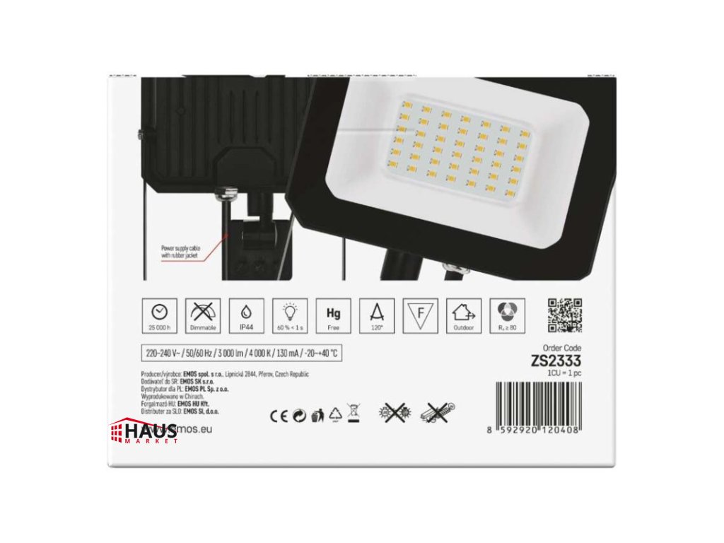 akumulátor: nie|dĺžka prívodného kábla: 20 cm|doba svietenia na AKU: neuvádza sa|dosah PIR senzora: 8 m|energetická trieda použitého zdroja svetla: –|farba: čierna|farba svetla: neutrálna biela|flicker-free: áno|frekvencia: 50/60 Hz|index podania farieb (CRI): Ra > 80|kategória: ESSENTIAL|krytie: IP44|materiál difúzora: sklo|materiál prívodného kábla: guma|materiál tela: hliník|napájanie: zo siete|napätie: 220–240 V~|PIR senzor: áno|počet priechodných zásuviek: neuvádza sa|použitie: závesná montáž|predajný obal: 1 ks, krabica|príkon: 30 W|prúd: 130 mA|rada: SIMPO|rozmer: 143 × 175 × 52 mm|rozsah pracovnej teploty: -20 °C až +40 °C|skúšobná žiarovka súčasťou balenia: nie|stmievanie: nie|stupeň ochrany proti mechanickým nárazom: neuvádza sa|svetelná účinnosť: 100 lm/W|svetelný tok: 3 000 lm|teplota chromatičnosti: 4 000 K|typ priechodných zásuviek: neuvádza sa|typ prívodného kábla: H05RN-F|typ stmievania: #|účinník: > 0,9|uhol vyžarovania: 120°|záručná doba: 2 roky|zdroj svetla: LED|životnosť: 25 000 hodínDodatočné parametre