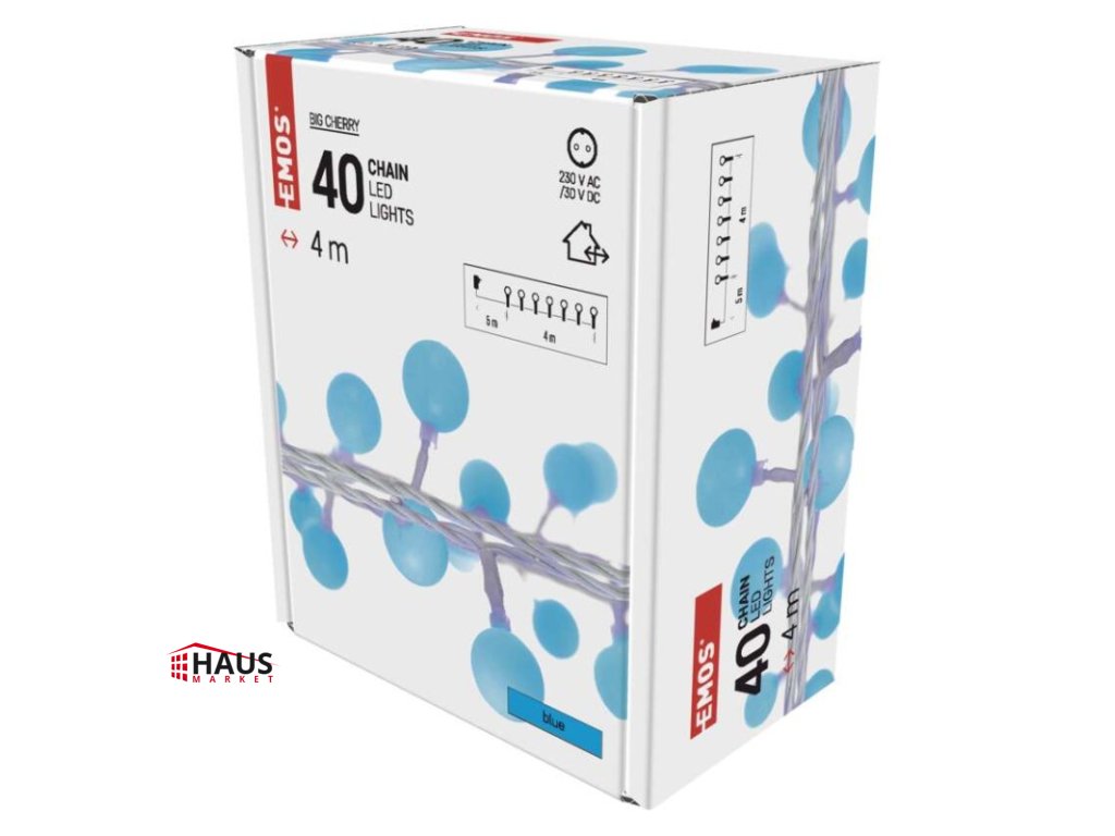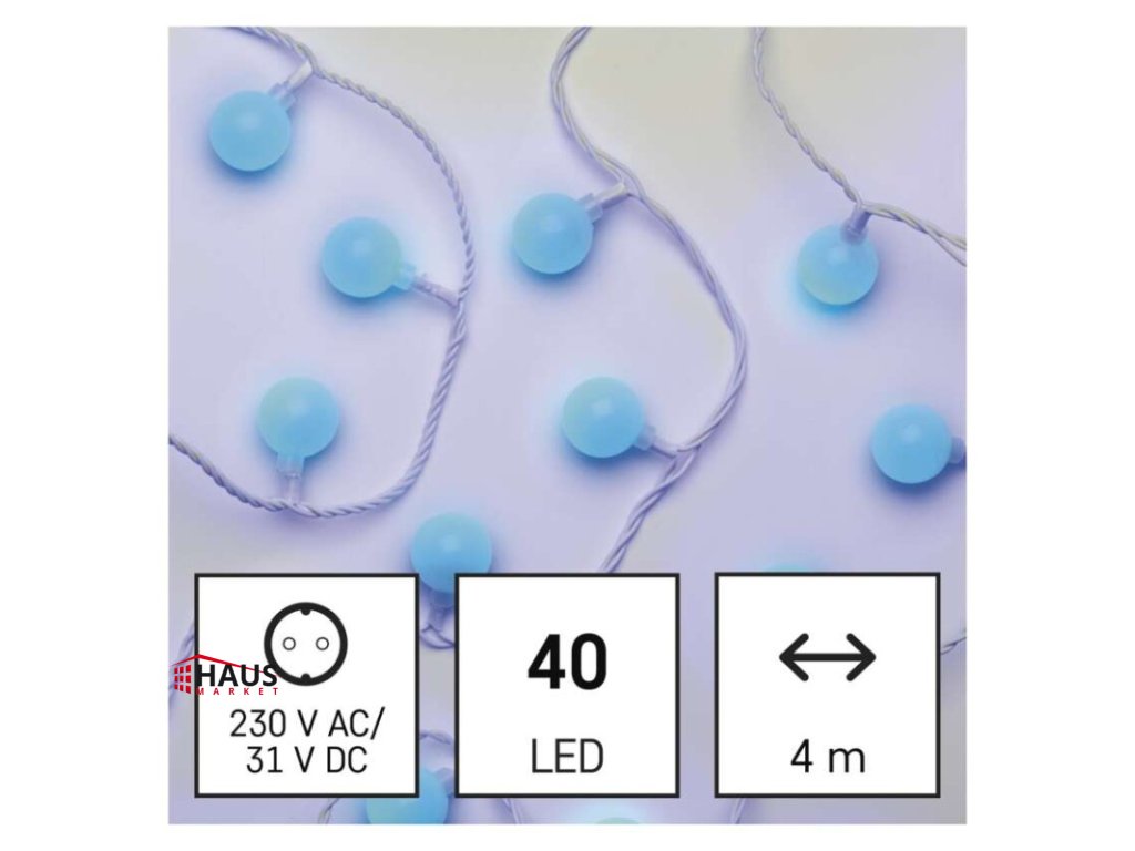 časovač: áno|diaľkový ovládač: nie|dĺžka prívodu: 5 m|farba drôtu: biela|farba svetla: modrá|funkcia: svieti|krytie: IP44|LED medzera: 10 cm|materiál: PVC|možnosť prepojenia: nie|počet LED: 40|použitie: vonkajšie aj vnútorné|predajný obal: 1 ks, krabica|pre výšku stromu: 100 cm|príkon: 3,6 W|produkt: reťaz|rozmer: 4 m|tvar: gulička|typ napájania: sieťový adaptér|veľkosť LED: 25 mm|vstupné napätie: 230 V AC|výstupné napätie: 31 V DC|záručná doba: 2 roky|životnosť: 10 000 hodínDodatočné parametre