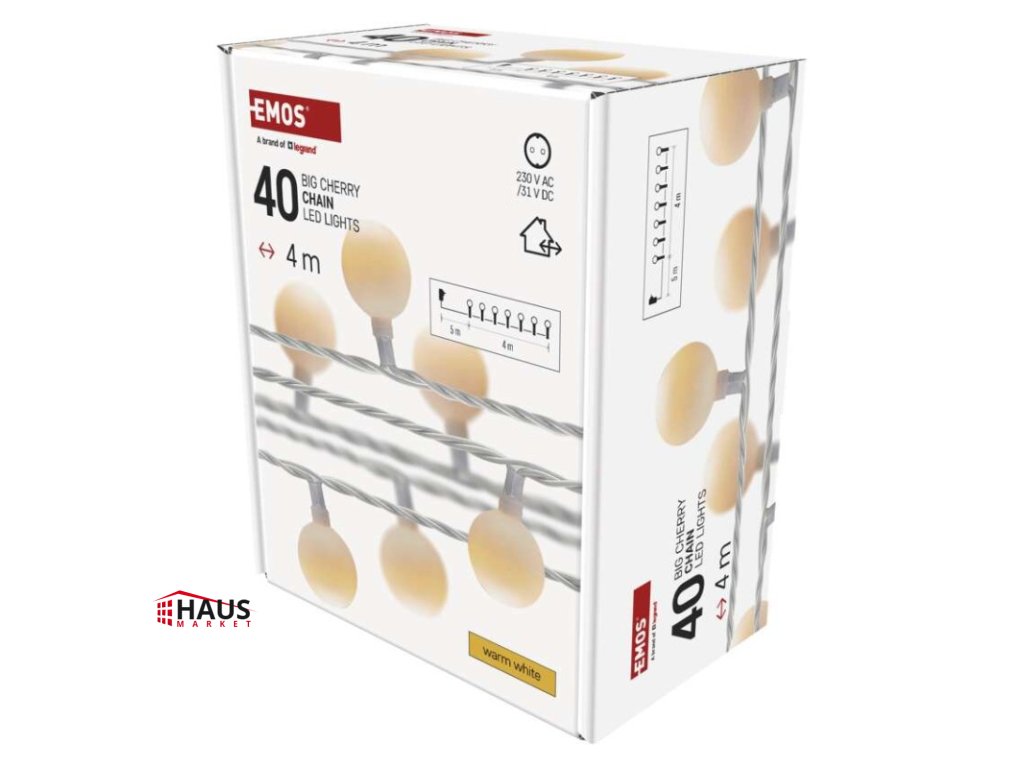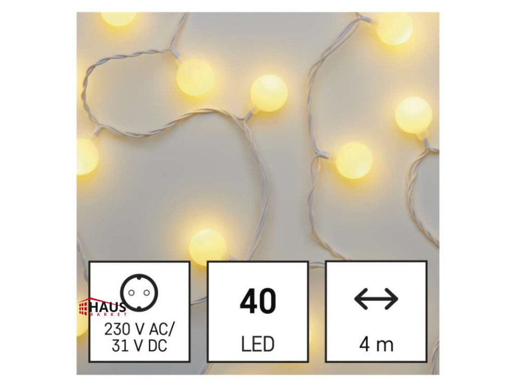 časovač: áno|diaľkový ovládač: nie|dĺžka prívodu: 5 m|farba drôtu: biela|farba svetla: teplá biela|funkcia: svieti|krytie: IP44|LED medzera: 10 cm|materiál: PVC|možnosť prepojenia: nie|počet LED: 40|použitie: vonkajšie aj vnútorné|predajný obal: 1 ks, krabica|pre výšku stromu: 100 cm|príkon: 3,6 W|produkt: reťaz|rozmer: 4 m|tvar: gulička|typ napájania: sieťový adaptér|veľkosť LED: 25 mm|vstupné napätie: 230 V AC|výstupné napätie: 31 V DC|záručná doba: 2 roky|životnosť: 10 000 hodínDodatočné parametre