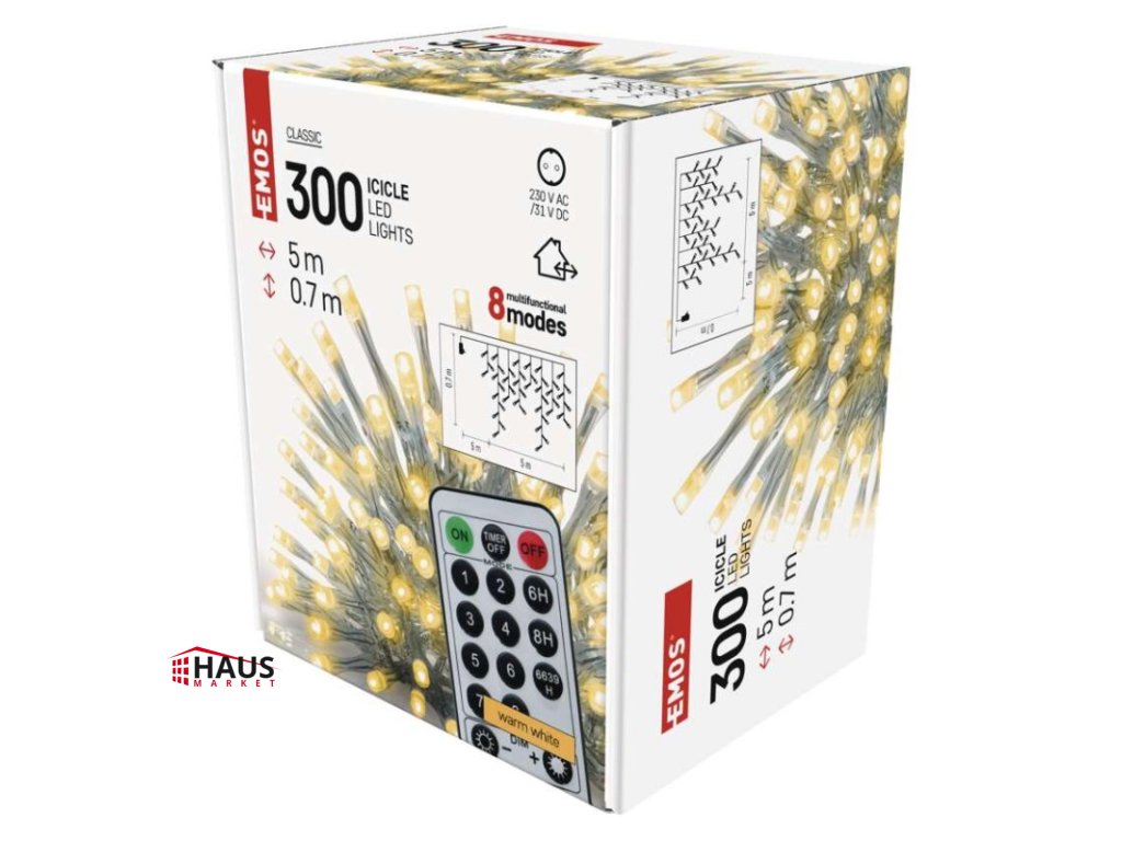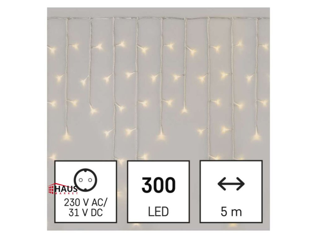 časovač: áno|diaľkový ovládač: áno (1× CR2032, súčasťou balenia)|dĺžka prívodu: 5 m|farba drôtu: transparentná|farba svetla: teplá biela|funkcia: 8 módov (multifunkcie)|krytie: IP44|LED medzera: 10 cm|materiál: PVC|možnosť prepojenia: nie|počet LED: 300|použitie: vonkajšie aj vnútorné|predajný obal: 1 ks, krabica|pre výšku stromu: neuvádza sa|príkon: 6 W|produkt: kvaple|rozmer: 5 × 0,7 m|tvar: klasický|typ napájania: sieťový adaptér|veľkosť LED: 5 mm|vstupné napätie: 230 V AC|výstupné napätie: 31 V DC|záručná doba: 2 roky|životnosť: 10 000 hodínDodatočné parametre