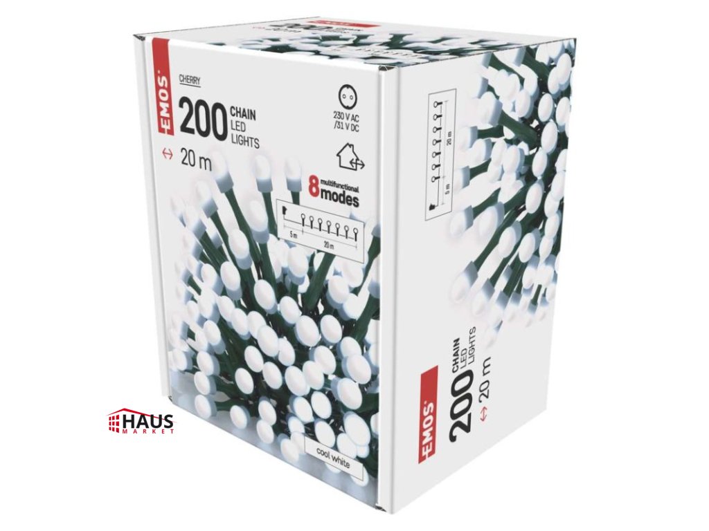časovač: nie|diaľkový ovládač: nie|dĺžka prívodu: 5 m|farba drôtu: zelená|farba svetla: studená biela|funkcia: 8 módov (multifunkcie)|krytie: IP44|LED medzera: 10 cm|materiál: PVC|možnosť prepojenia: nie|počet LED: 200|použitie: vonkajšie aj vnútorné|predajný obal: 1 ks, krabica|pre výšku stromu: 210 cm|príkon: 3,6 W|produkt: reťaz|rozmer: 20 m|tvar: gulička|typ napájania: sieťový adaptér|veľkosť LED: 10 mm|vstupné napätie: 230 V AC|výstupné napätie: 31 V DC|záručná doba: 2 roky|životnosť: 10 000 hodínDodatočné parametre