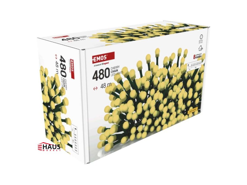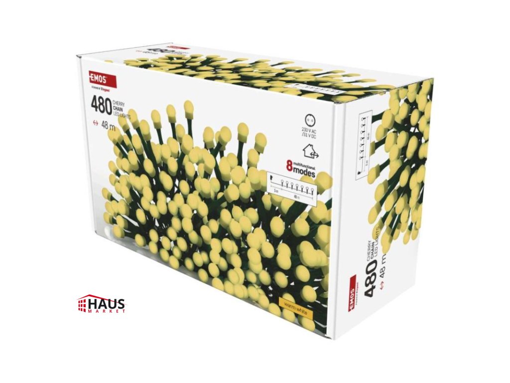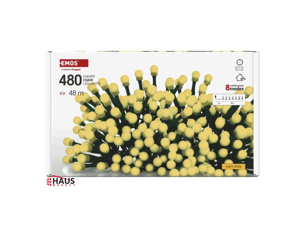LED vianočná cherry reťaz – guličky, 48 m, vonk. aj vnútor.,teplá biela, programy, časovač