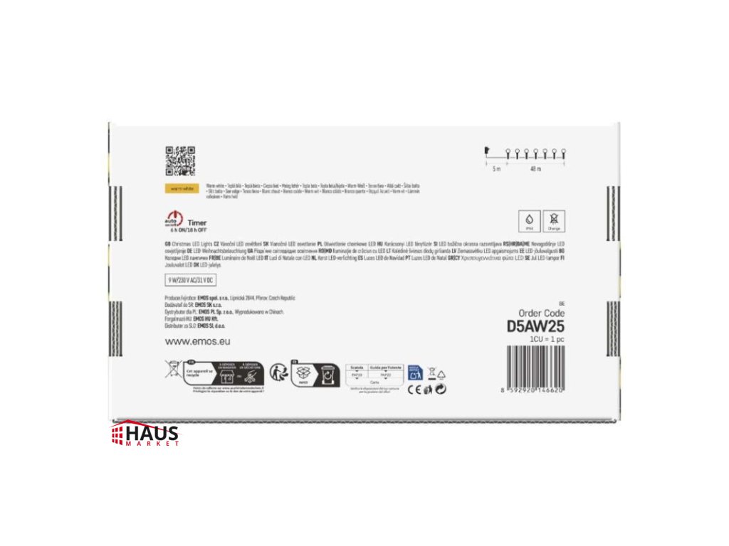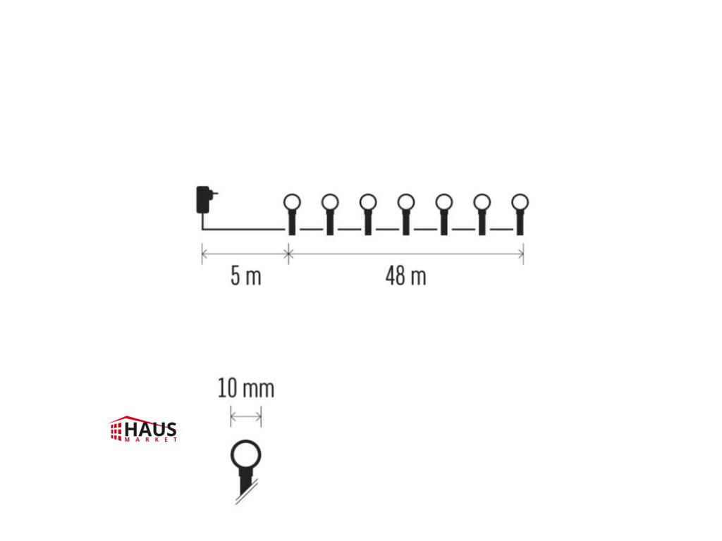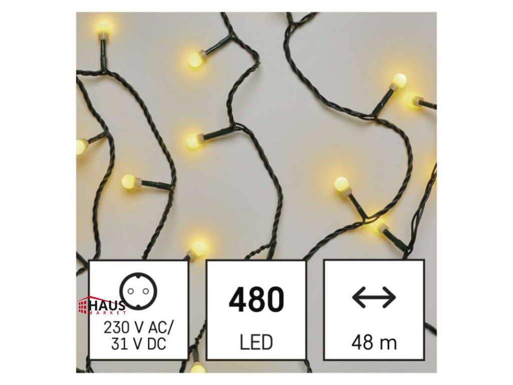 časovač: áno|ďalšie funkcie: –|diaľkový ovládač: nie|dĺžka prívodu: 5 m|farba drôtu: zelená|farba svetla: teplá biela|funkcia: 8 módov (multifunkcie)|jazyky aplikácie: –|kompatibilita: –|krytie: IP44|LED medzera: 10 cm|materiál: PVC|možnosť prepojenia: nie|notifikácie do mobilnej aplikácie: nie|ovládanie hlasovými asistentmi: nie|počet LED: 480|podporované operačné systémy: –|použitie: vonkajšie aj vnútorné|predajný obal: 1 ks, krabica|prenosová frekvencia: –|pre výšku stromu: 300 cm|príkon: 9 W|produkt: reťaz|protokol: –|rozmer: 48 m|tvar: gulička|typ napájania: sieťový adaptér|veľkosť LED: 10 mm|vstupné napätie: 230 V AC|výstupné napätie: 31 V DC|záručná doba: 2 roky|životnosť: 10 000 hodínDodatočné parametre