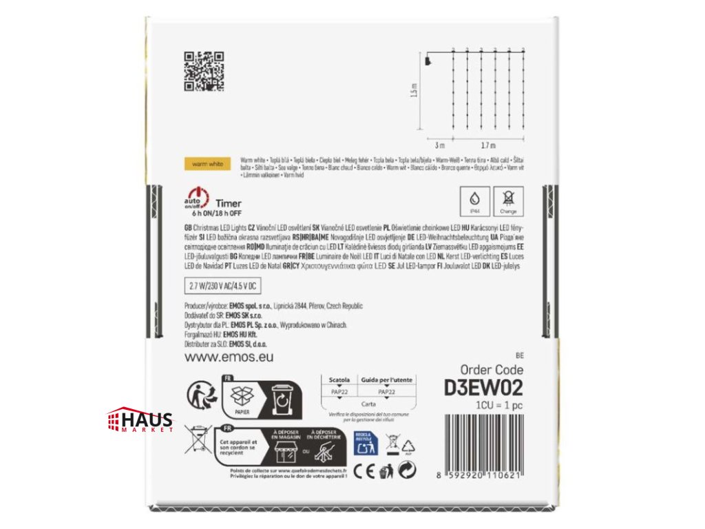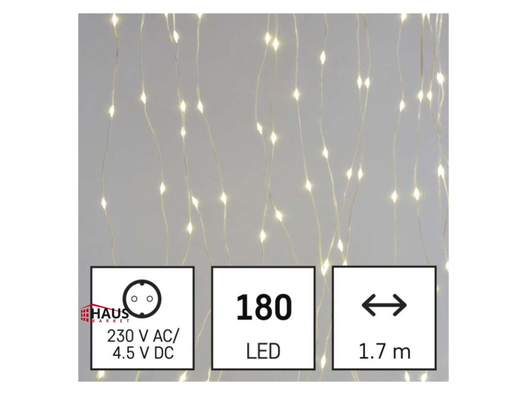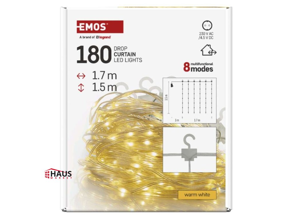 časovač: áno|ďalšie funkcie: –|diaľkový ovládač: nie|dĺžka prívodu: 3 m|farba drôtu: transparentná|farba svetla: teplá biela|funkcia: 8 módov (multifunkcie)|jazyky aplikácie: –|kompatibilita: –|krytie: IP44|LED medzera: neuvádza sa|materiál: #|možnosť prepojenia: nie|notifikácie do mobilnej aplikácie: #|ovládanie hlasovými asistentmi: #|počet LED: 180|podporované operačné systémy: –|použitie: vonkajšie aj vnútorné|predajný obal: 1 ks, krabica|prenosová frekvencia: –|pre výšku stromu: neuvádza sa|príkon: 2,7 W|produkt: záclona|protokol: –|rozmer: 1,7 × 1,5 m|tvar: drop|typ napájania: sieťový adaptér|veľkosť LED: neuvádza sa|vstupné napätie: 230 V AC|výstupné napätie: 4,5 V DC|záručná doba: 2 roky|životnosť: 10 000 hodínDodatočné parametre