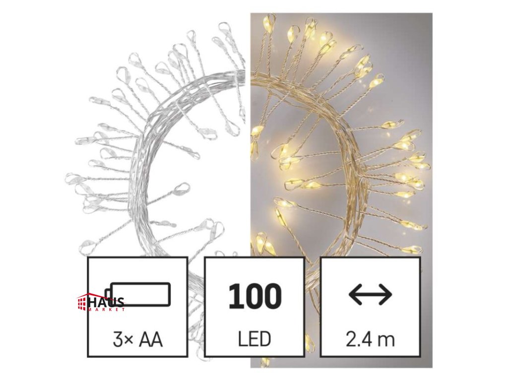 časovač: áno|diaľkový ovládač: nie|dĺžka prívodu: 0,3 m|farba drôtu: strieborná|farba svetla: teplá biela|funkcia: svieti|krytie: IP20|LED medzera: 2,4 cm|materiál: kov|možnosť prepojenia: nie|počet LED: 100|použitie: vnútorné|predajný obal: 1 ks, krabica|pre výšku stromu: neuvádza sa|príkon: 0,9 W|produkt: ježko|rozmer: 2,4 m|tvar: nano|typ napájania: batéria 3× AA (nie je súčasťou balenia)|veľkosť LED: 3 mm (nano)|vstupné napätie: neuvádza sa|výstupné napätie: 4,5 V DC|záručná doba: 2 roky|životnosť: 10 000 hodínDodatočné parametre