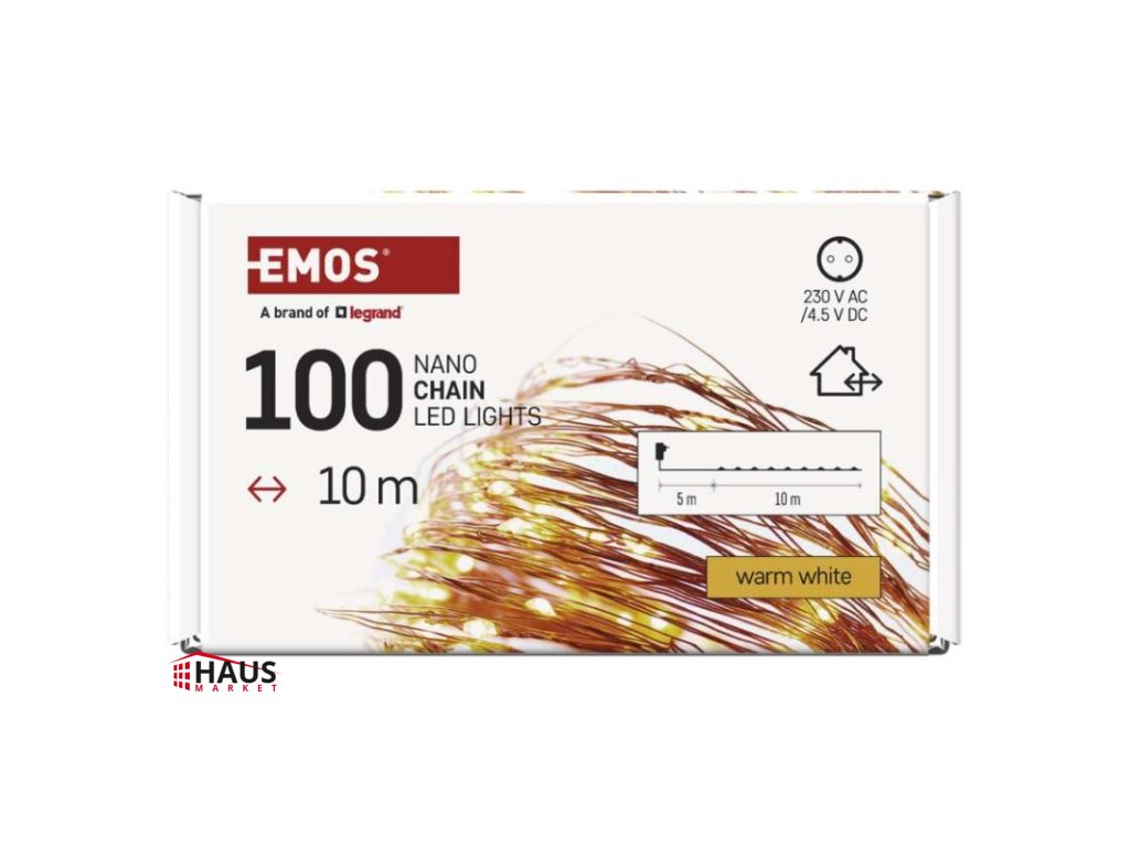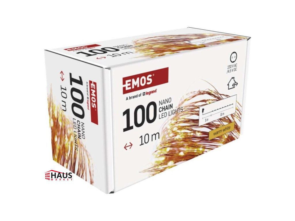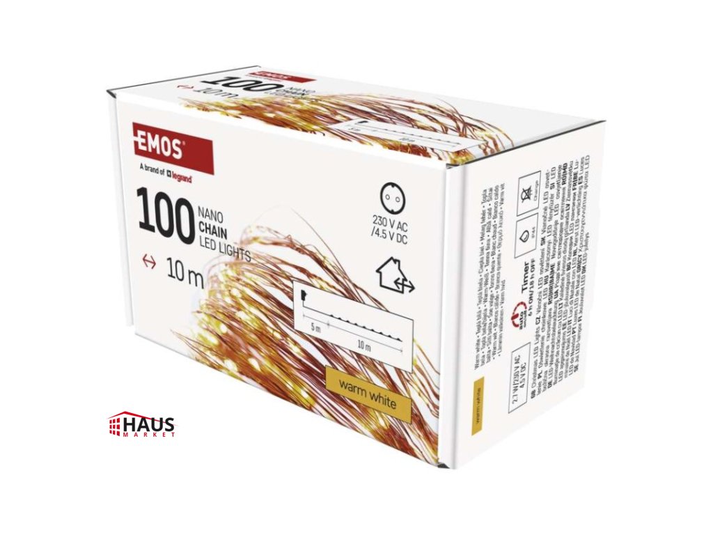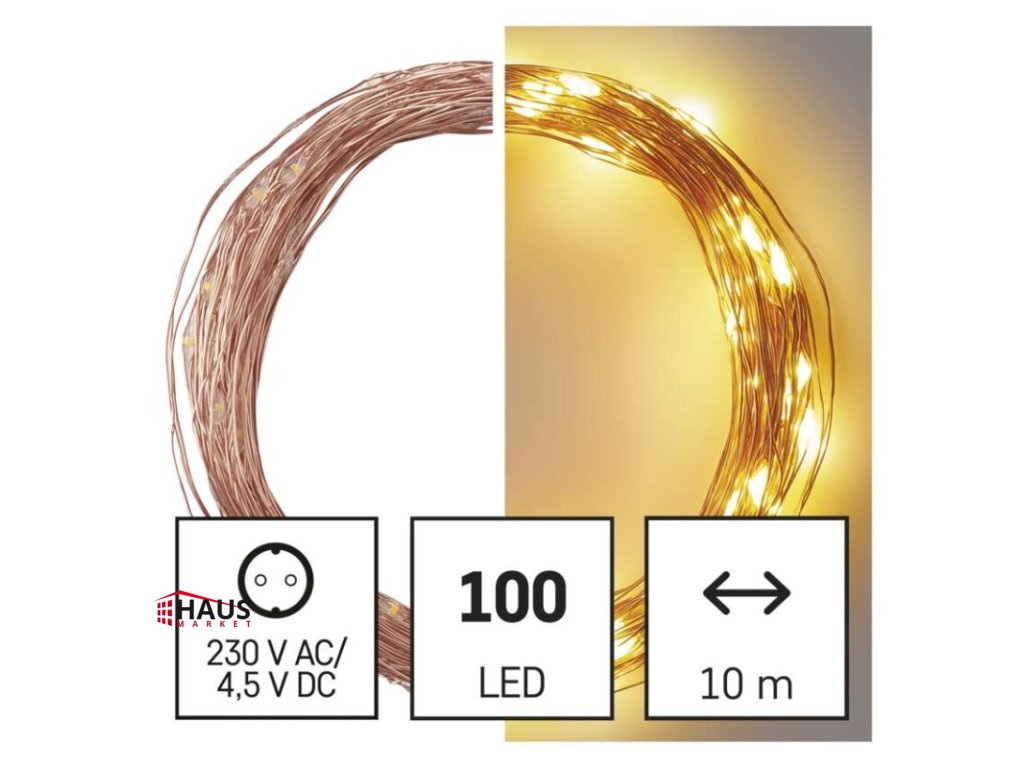 časovač: áno|diaľkový ovládač: nie|dĺžka prívodu: 5 m|farba drôtu: medená|farba svetla: teplá biela|funkcia: svieti|krytie: IP44|LED medzera: 10 cm|materiál: kov|možnosť prepojenia: nie|počet LED: 100|použitie: vonkajšie aj vnútorné|predajný obal: 1 ks, krabica|pre výšku stromu: 160 cm|príkon: 2,7 W|produkt: nano reťaz|rozmer: 10 m|tvar: nano|typ napájania: sieťový adaptér|veľkosť LED: 3 mm (nano)|vstupné napätie: 230 V AC|výstupné napätie: 4,5 V DC|záručná doba: 2 roky|životnosť: 10 000 hodínDodatočné parametre