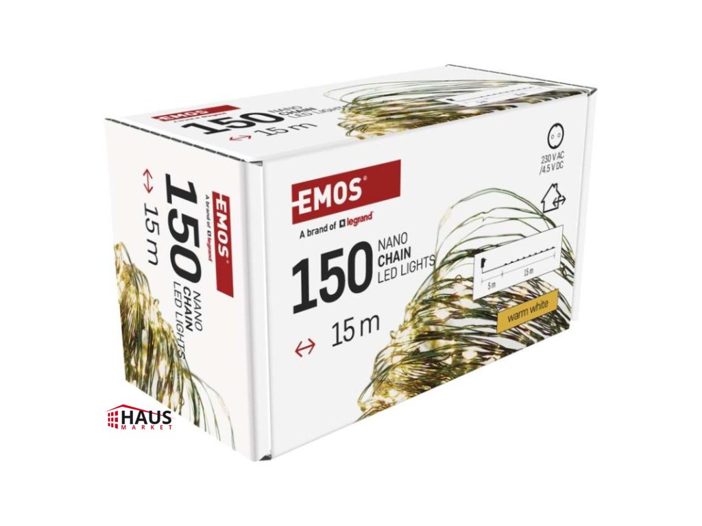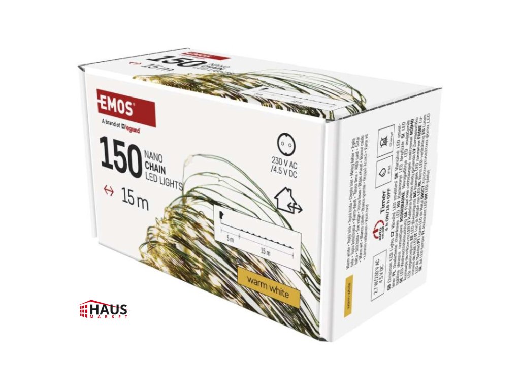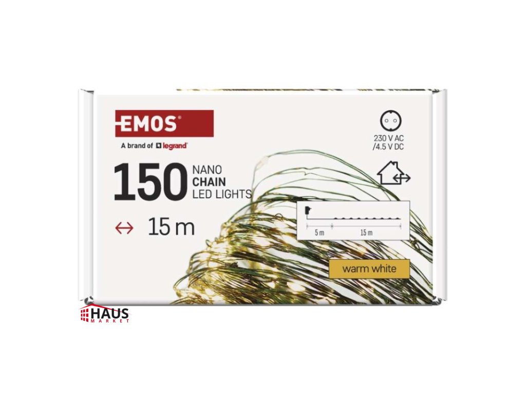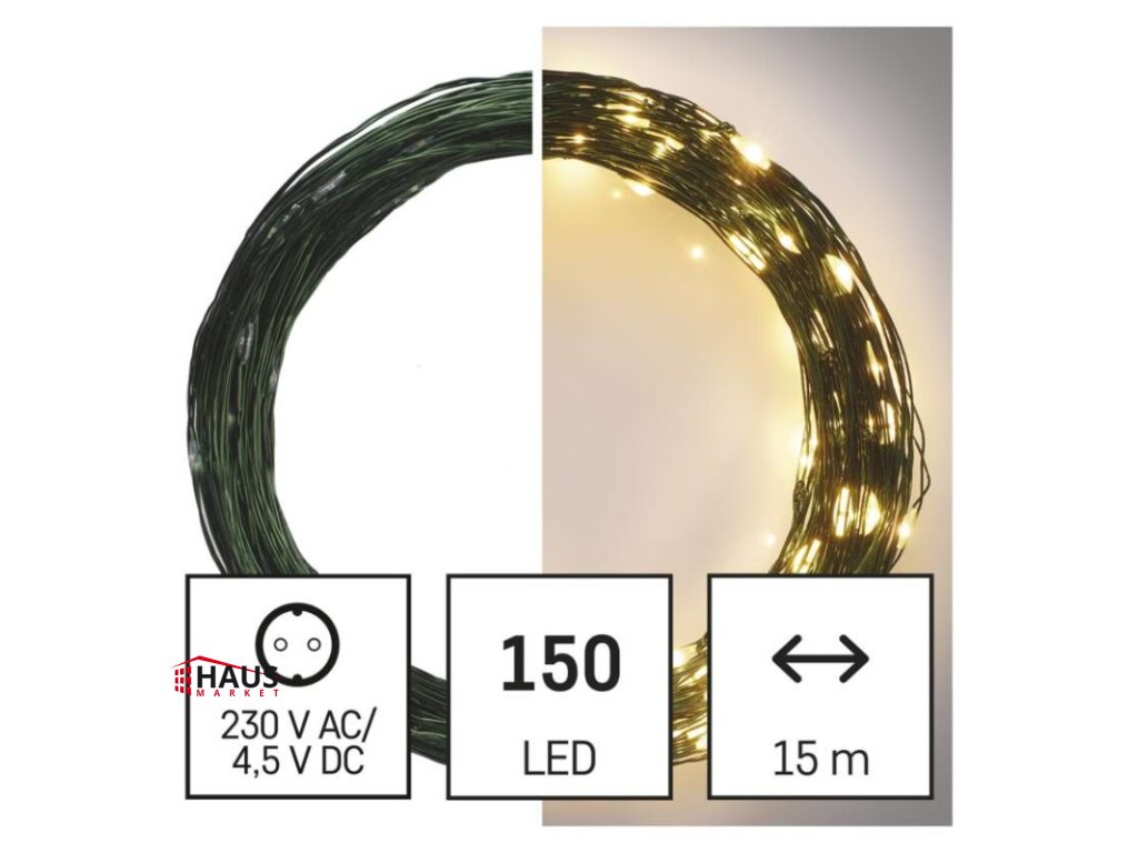 časovač: áno|diaľkový ovládač: nie|dĺžka prívodu: 5 m|farba drôtu: zelená|farba svetla: teplá biela|funkcia: svieti|krytie: IP44|LED medzera: 10 cm|materiál: kov|možnosť prepojenia: nie|počet LED: 150|použitie: vonkajšie aj vnútorné|predajný obal: 1 ks, krabica|pre výšku stromu: 170 cm|príkon: 2,7 W|produkt: nano reťaz|rozmer: 15 m|tvar: nano|typ napájania: sieťový adaptér|veľkosť LED: 3 mm (nano)|vstupné napätie: 230 V AC|výstupné napätie: 4,5 V DC|záručná doba: 2 roky|životnosť: 10 000 hodínDodatočné parametre