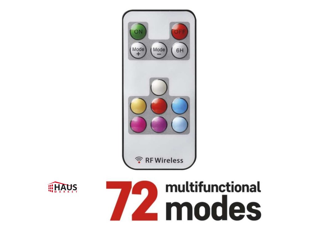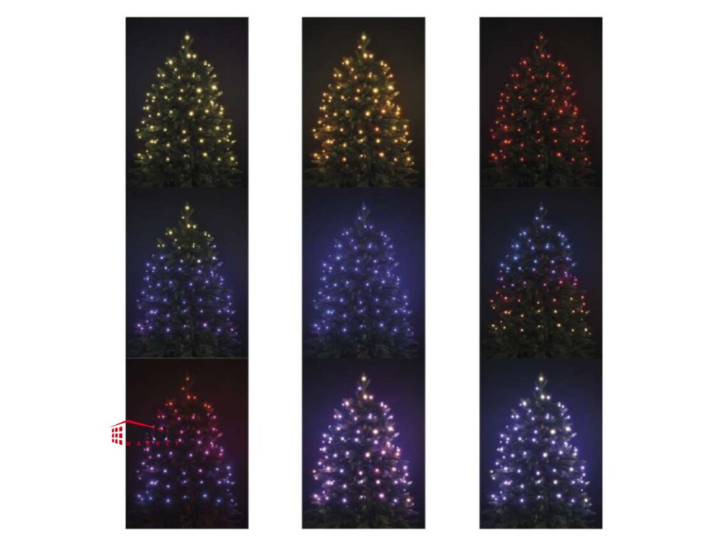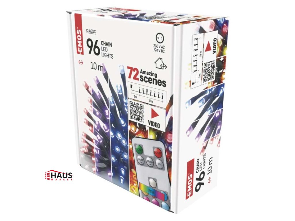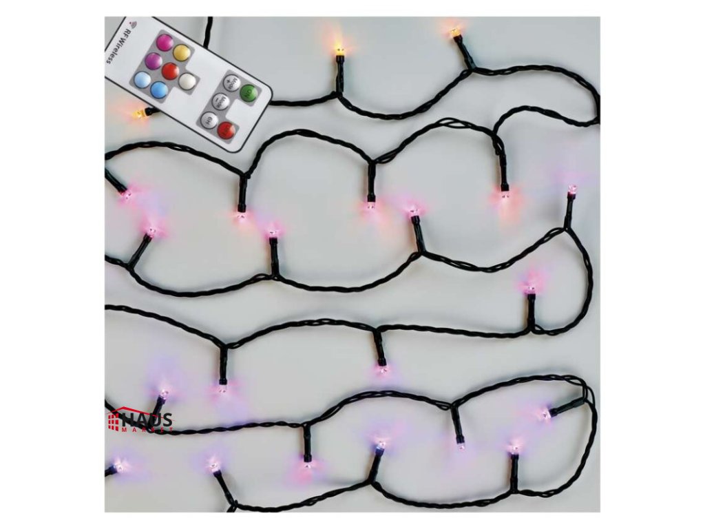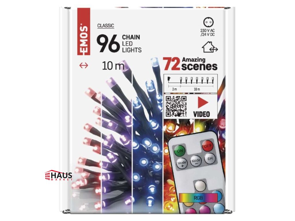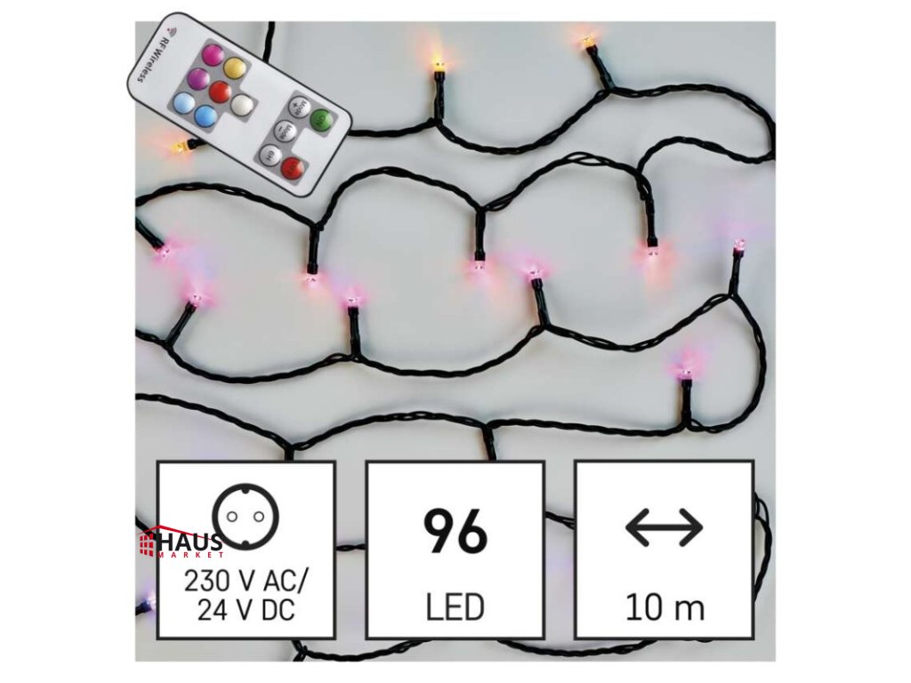 časovač: áno|diaľkový ovládač: áno (1× CR2032, súčasťou balenia)|dĺžka prívodu: 3 m|farba drôtu: čierna|farba svetla: multicolor|funkcia: 72 módov|krytie: IP44|LED medzera: 10 cm|materiál: PVC|možnosť prepojenia: nie|počet LED: 96|použitie: vonkajšie aj vnútorné|predajný obal: 1 ks, krabica|pre výšku stromu: 160 cm|príkon: 12 W|produkt: reťaz|rozmer: 10 m|tvar: klasický|typ napájania: sieťový adaptér|veľkosť LED: 5 mm|vstupné napätie: 230 V AC|výstupné napätie: 24 V DC|záručná doba: 2 roky|životnosť: 10 000 hodínDodatočné parametre