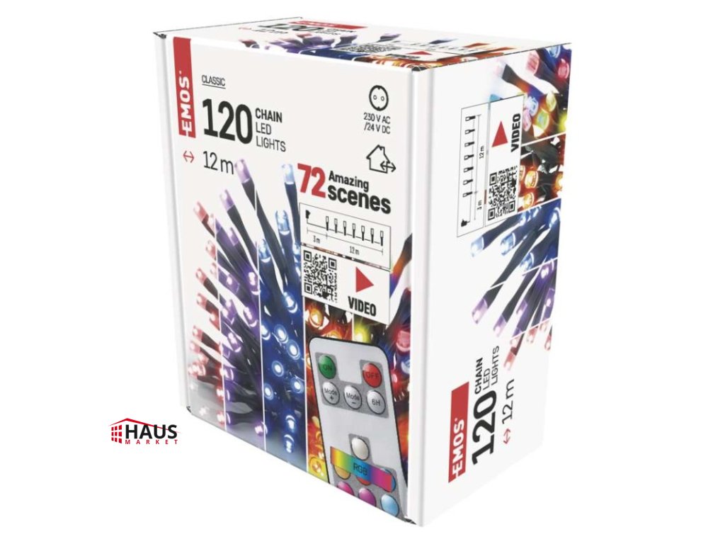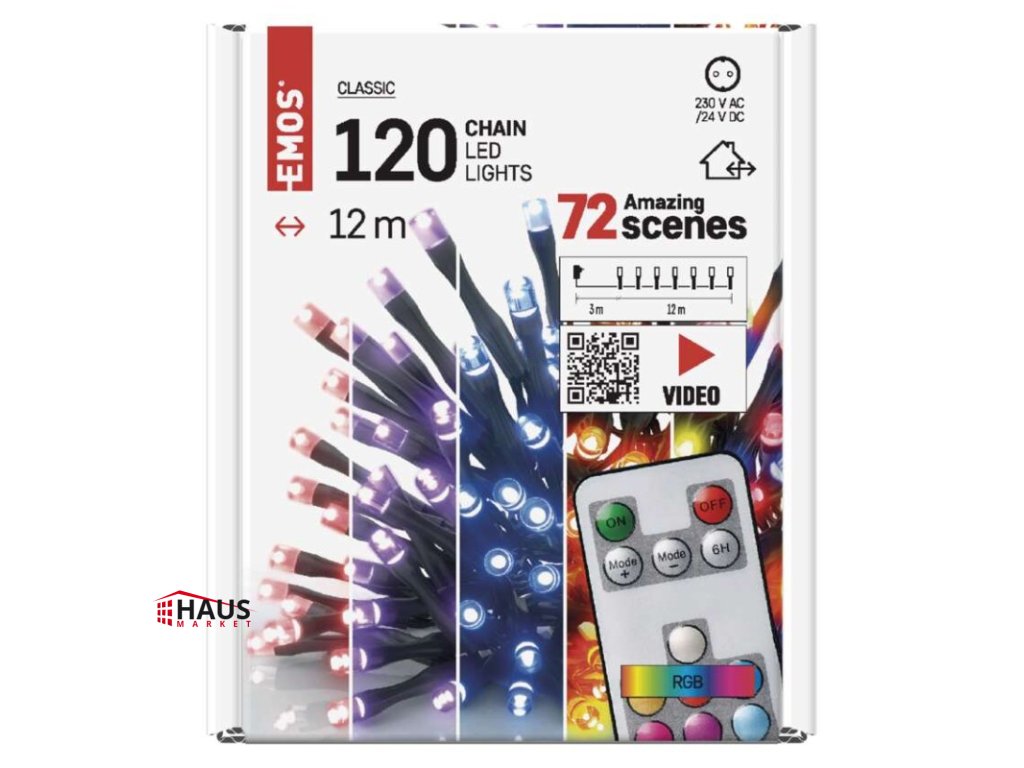 časovač: áno|diaľkový ovládač: áno (1× CR2032, súčasťou balenia)|dĺžka prívodu: 3 m|farba drôtu: čierna|farba svetla: multicolor|funkcia: 72 módov|krytie: IP44|LED medzera: 10 cm|materiál: PVC|možnosť prepojenia: nie|počet LED: 120|použitie: vonkajšie aj vnútorné|predajný obal: 1 ks, krabica|pre výšku stromu: 170 cm|príkon: 12 W|produkt: reťaz|rozmer: 12 m|tvar: klasický|typ napájania: sieťový adaptér|veľkosť LED: 5 mm|vstupné napätie: 230 V AC|výstupné napätie: 24 V DC|záručná doba: 2 roky|životnosť: 10 000 hodínDodatočné parametre