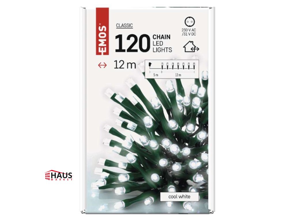 časovač: áno|diaľkový ovládač: nie|dĺžka prívodu: 5 m|farba drôtu: zelená|farba svetla: studená biela|funkcia: svieti|krytie: IP44|LED medzera: 10 cm|materiál: PVC|možnosť prepojenia: nie|počet LED: 120|použitie: vonkajšie aj vnútorné|predajný obal: 1 ks, krabica|pre výšku stromu: 170 cm|príkon: 3,6 W|produkt: reťaz|rozmer: 12 m|tvar: klasický|typ napájania: sieťový adaptér|veľkosť LED: 5 mm|vstupné napätie: 230 V AC|výstupné napätie: 31 V DC|záručná doba: 2 roky|životnosť: 10 000 hodínDodatočné parametre