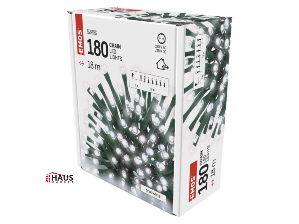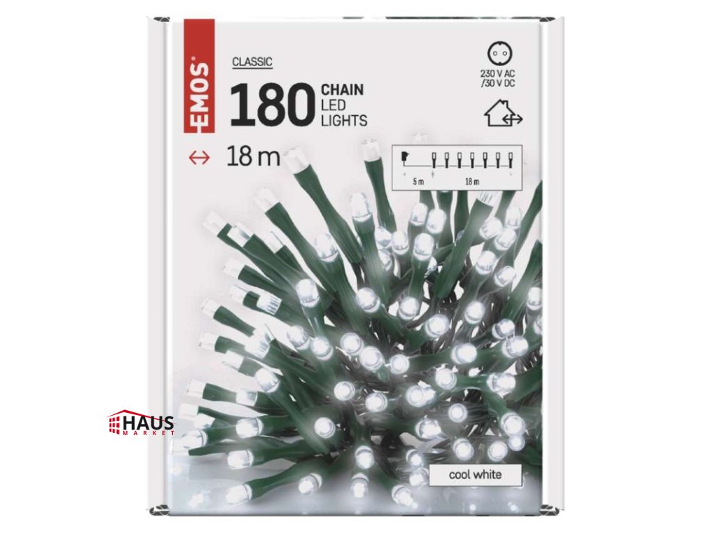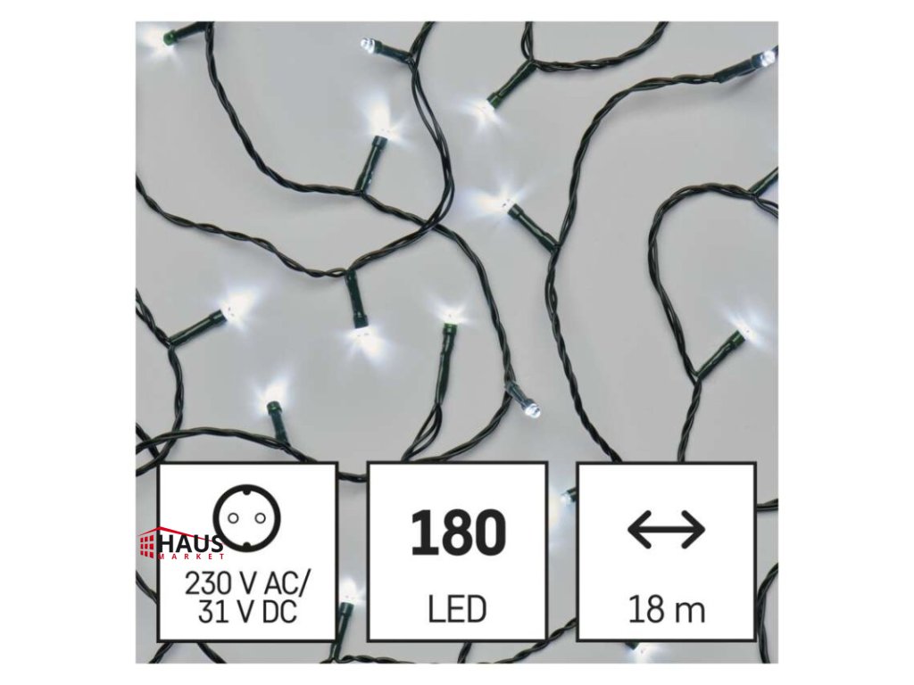 časovač: áno|diaľkový ovládač: nie|dĺžka prívodu: 5 m|farba drôtu: zelená|farba svetla: studená biela|funkcia: svieti|krytie: IP44|LED medzera: 10 cm|materiál: PVC|možnosť prepojenia: nie|počet LED: 180|použitie: vonkajšie aj vnútorné|predajný obal: 1 ks, krabica|pre výšku stromu: 200 cm|príkon: 3,6 W|produkt: reťaz|rozmer: 18 m|tvar: klasický|typ napájania: sieťový adaptér|veľkosť LED: 5 mm|vstupné napätie: 230 V AC|výstupné napätie: 31 V DC|záručná doba: 2 roky|životnosť: 10 000 hodínDodatočné parametre