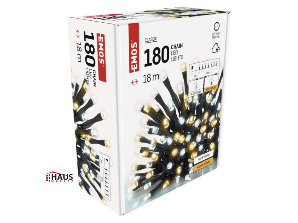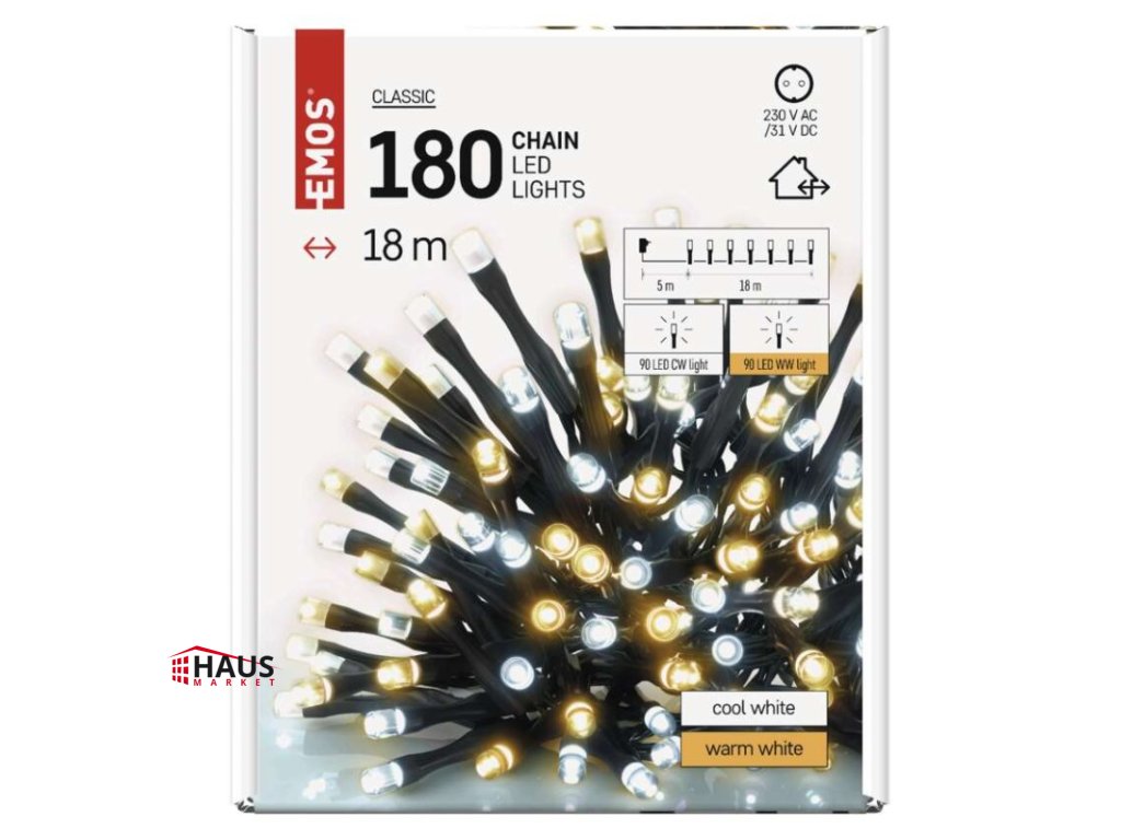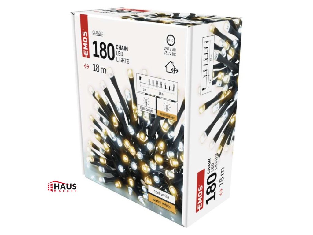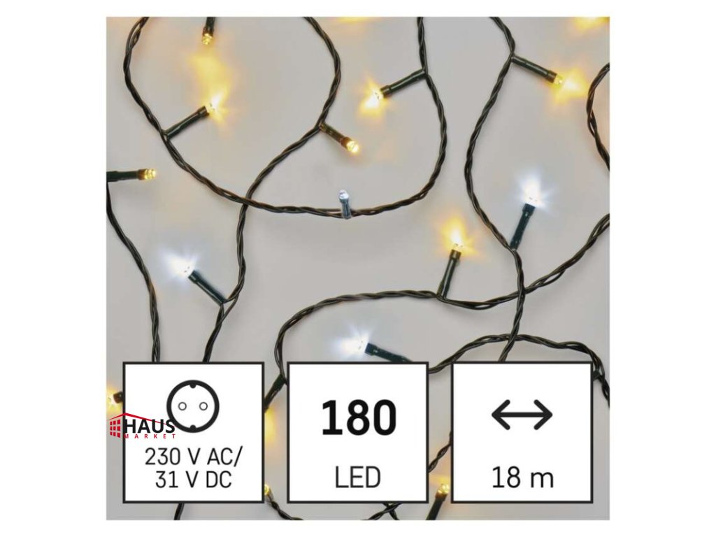 časovač: áno|diaľkový ovládač: nie|dĺžka prívodu: 5 m|farba drôtu: čierna|farba svetla: studená/teplá biela|funkcia: svieti|krytie: IP44|LED medzera: 10 cm|materiál: PVC|možnosť prepojenia: nie|počet LED: 180|použitie: vonkajšie aj vnútorné|predajný obal: 1 ks, krabica|pre výšku stromu: 200 cm|príkon: 3,6 W|produkt: reťaz|rozmer: 18 m|tvar: klasický|typ napájania: sieťový adaptér|veľkosť LED: 5 mm|vstupné napätie: 230 V AC|výstupné napätie: 31 V DC|záručná doba: 2 roky|životnosť: 10 000 hodínDodatočné parametre