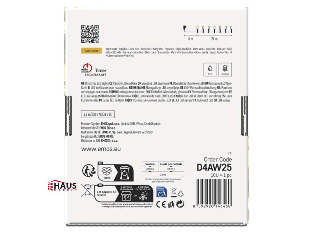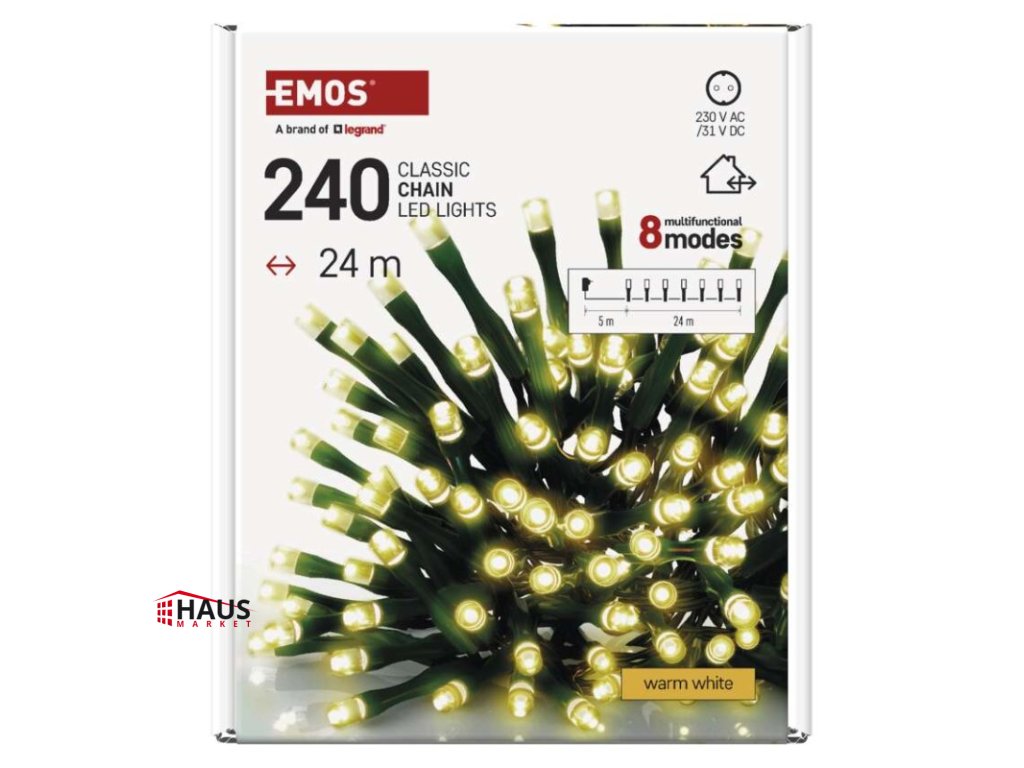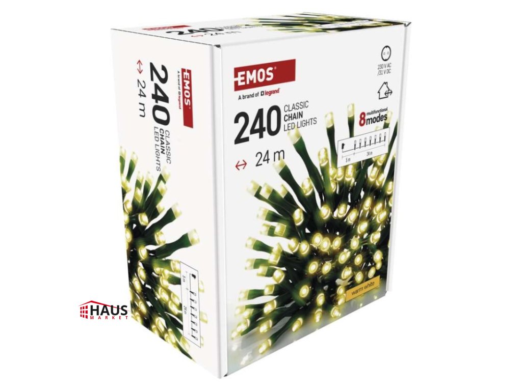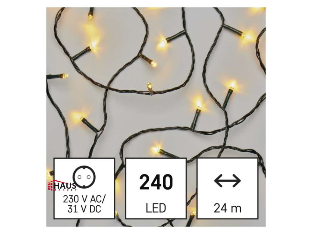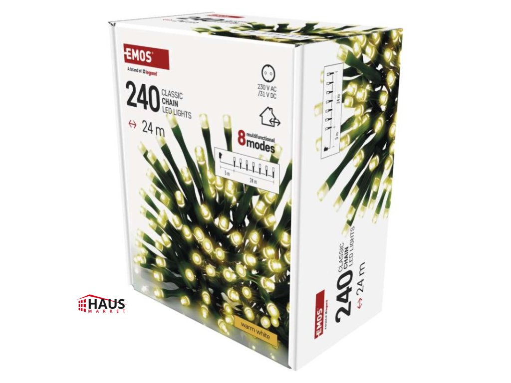 časovač: áno|ďalšie funkcie: –|diaľkový ovládač: nie|dĺžka prívodu: 5 m|farba drôtu: zelená|farba svetla: teplá biela|funkcia: 8 módov (multifunkcie)|jazyky aplikácie: –|kompatibilita: –|krytie: IP44|LED medzera: 10 cm|materiál: PVC|možnosť prepojenia: nie|notifikácie do mobilnej aplikácie: nie|ovládanie hlasovými asistentmi: nie|počet LED: 240|podporované operačné systémy: –|použitie: vonkajšie aj vnútorné|predajný obal: 1 ks, krabica|prenosová frekvencia: –|pre výšku stromu: 230 cm|príkon: 3,6 W|produkt: reťaz|protokol: –|rozmer: 24 m|tvar: klasický|typ napájania: sieťový adaptér|veľkosť LED: 5 mm|vstupné napätie: 230 V AC|výstupné napätie: 31 V DC|záručná doba: 2 roky|životnosť: 10 000 hodínDodatočné parametre
