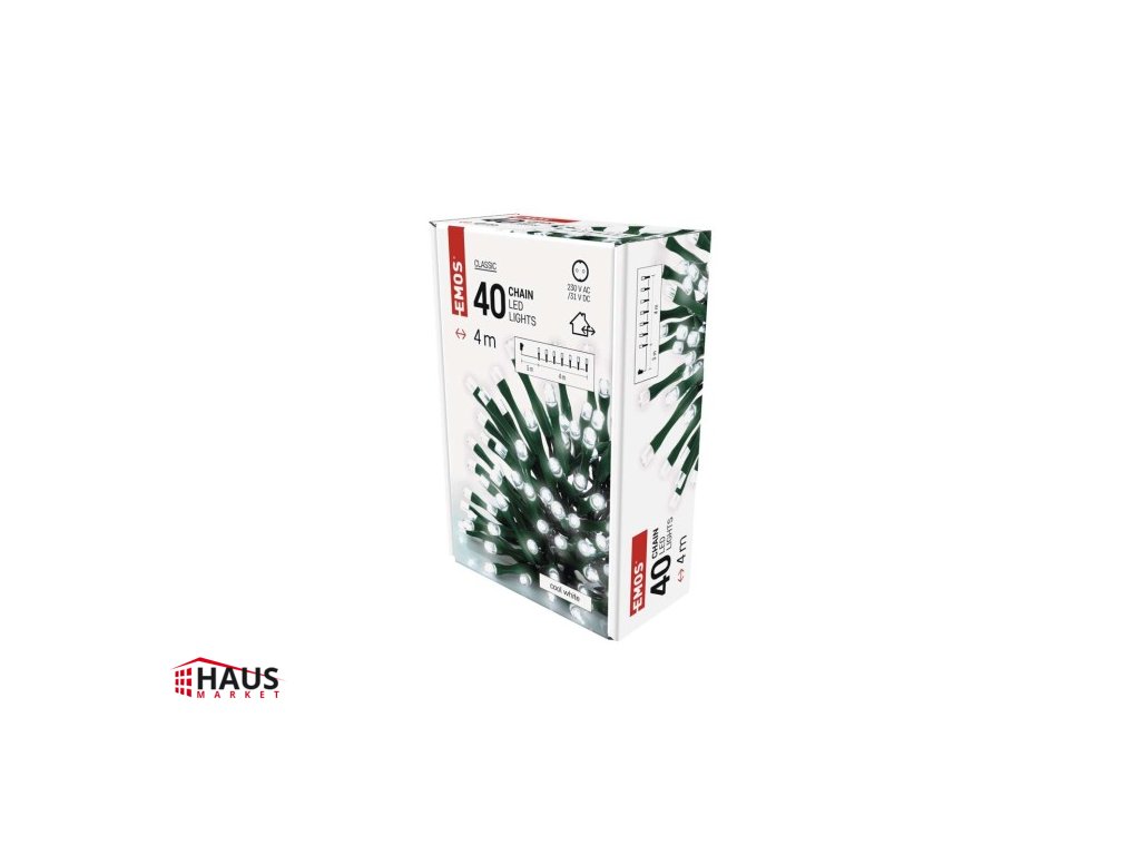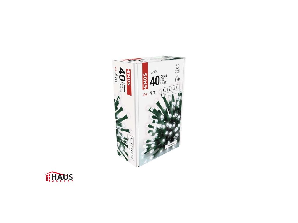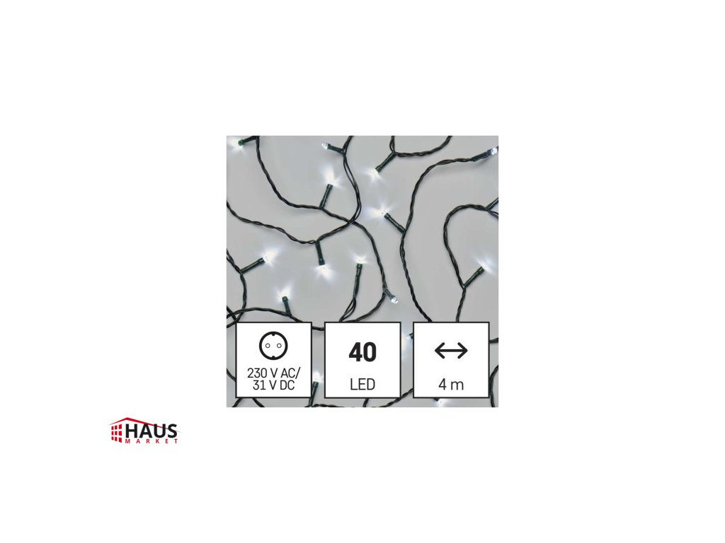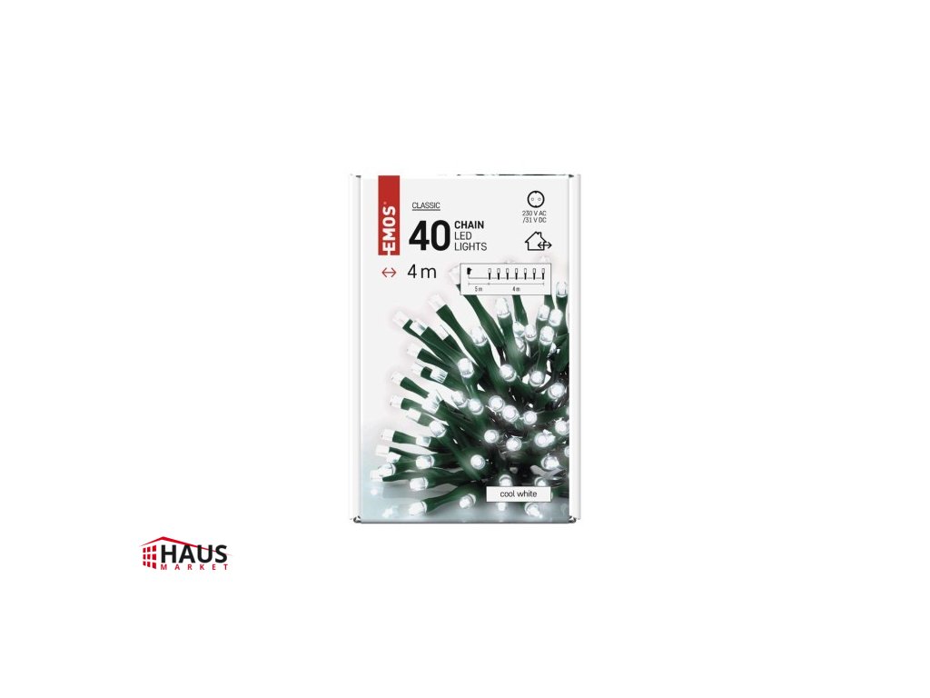 časovač: áno|diaľkový ovládač: nie|dĺžka prívodu: 5 m|farba drôtu: zelená|farba svetla: studená biela|funkcia: svieti|krytie: IP44|LED medzera: 10 cm|materiál: PVC|možnosť prepojenia: nie|počet LED: 40|použitie: vonkajšie aj vnútorné|predajný obal: 1 ks, krabica|pre výšku stromu: 100 cm|príkon: 3,6 W|produkt: reťaz|rozmer: 4 m|tvar: klasický|typ napájania: sieťový adaptér|veľkosť LED: 5 mm|vstupné napätie: 230 V AC|výstupné napätie: 31 V DC|záručná doba: 2 roky|životnosť: 10 000 hodínDodatočné parametre