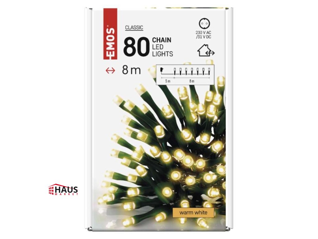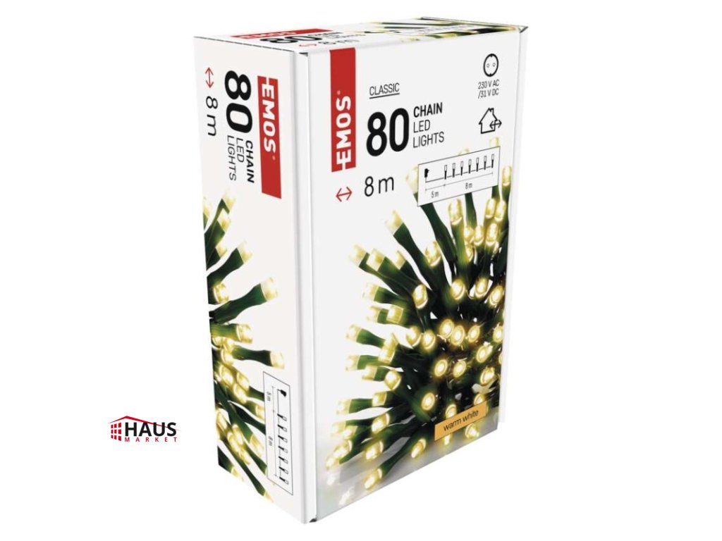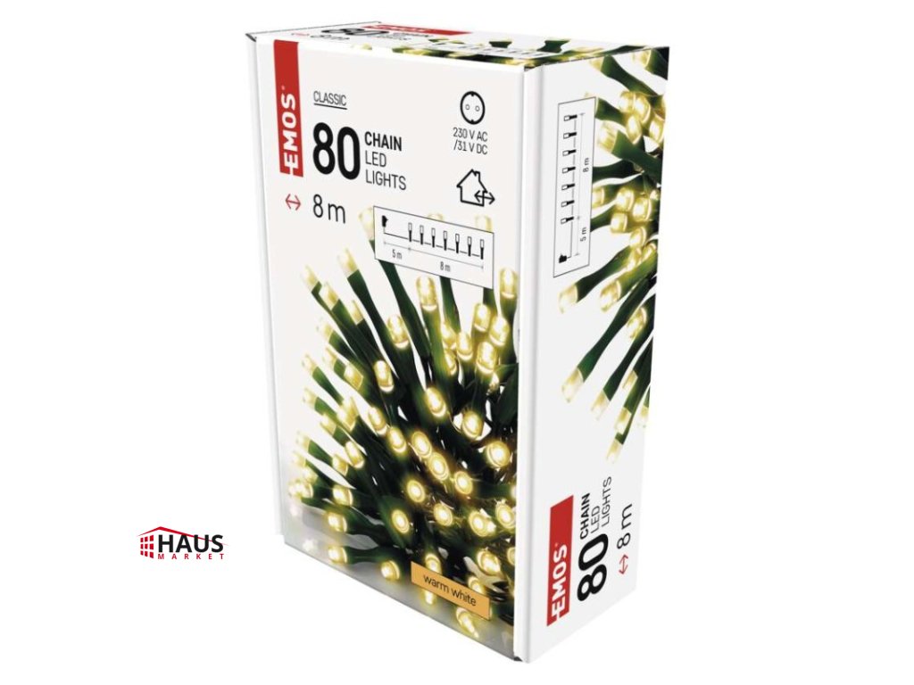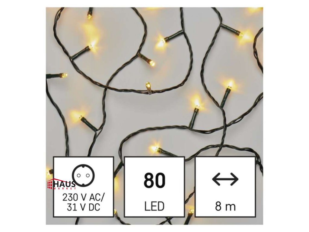 časovač: áno|diaľkový ovládač: nie|dĺžka prívodu: 5 m|farba drôtu: zelená|farba svetla: teplá biela|funkcia: svieti|krytie: IP44|LED medzera: 10 cm|materiál: PVC|možnosť prepojenia: nie|počet LED: 80|použitie: vonkajšie aj vnútorné|predajný obal: 1 ks, krabica|pre výšku stromu: 140 cm|príkon: 3,6 W|produkt: reťaz|rozmer: 8 m|tvar: klasický|typ napájania: sieťový adaptér|veľkosť LED: 5 mm|vstupné napätie: 230 V AC|výstupné napätie: 31 V DC|záručná doba: 2 roky|životnosť: 10 000 hodínDodatočné parametre