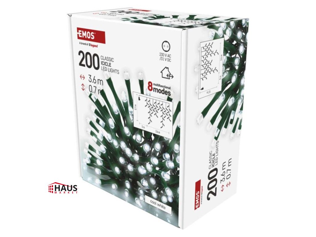časovač: nie|diaľkový ovládač: nie|dĺžka prívodu: 5 m|farba drôtu: zelená|farba svetla: studená biela|funkcia: 8 módov (multifunkcie)|krytie: IP44|LED medzera: 10 cm|materiál: PVC|možnosť prepojenia: nie|počet LED: 200|použitie: vonkajšie aj vnútorné|predajný obal: 1 ks, krabica|pre výšku stromu: neuvádza sa|príkon: 3,6 W|produkt: kvaple|rozmer: 3,6 × 0,7 m|tvar: klasický|typ napájania: sieťový adaptér|veľkosť LED: 5 mm|vstupné napätie: 230 V AC|výstupné napätie: 31 V DC|záručná doba: 2 roky|životnosť: 10 000 hodínDodatočné parametre