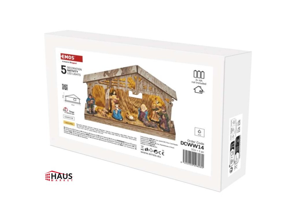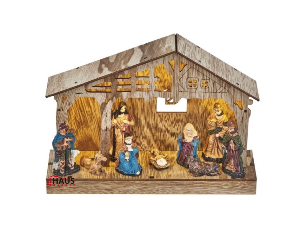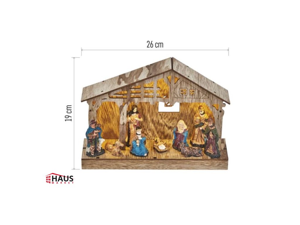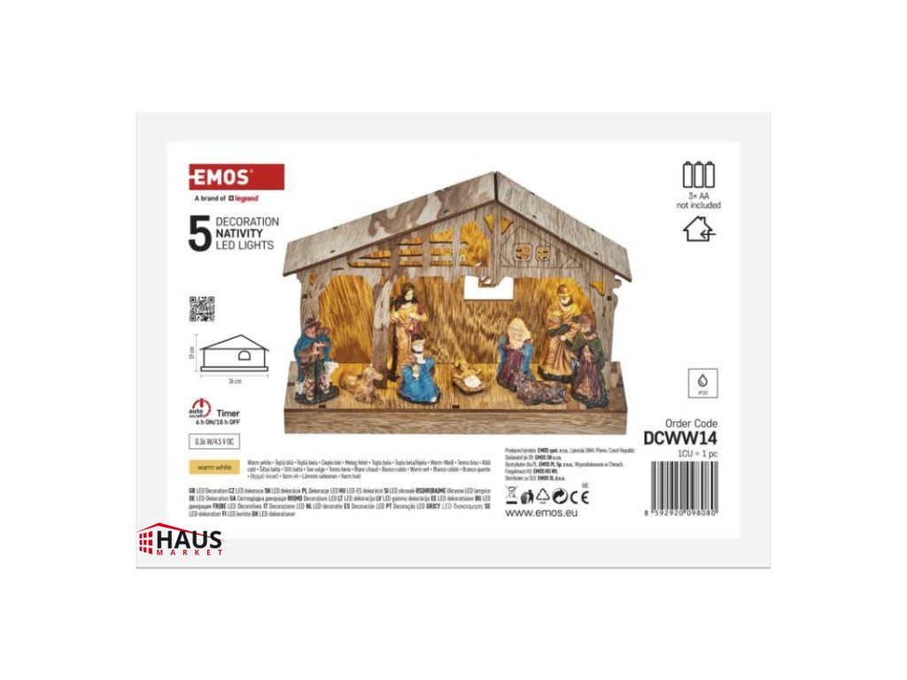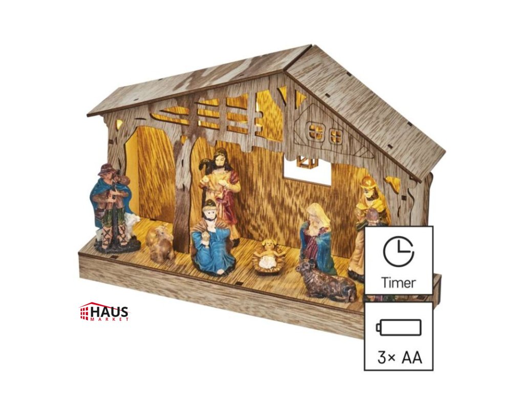 časovač: áno|diaľkový ovládač: nie|dĺžka prívodu: neuvádza sa|farba drôtu: neuvádza sa|farba svetla: teplá biela|krytie: IP20|materiál: drevo|počet LED: 5|použitie: vnútorné|predajný obal: 1 ks, krabica|príkon: 0,36 W|produkt: betlehem|rozmer: 26 × 19 cm|typ napájania: batéria 3× AA (nie je súčasťou balenia)|vstupné napätie: neuvádza sa|výstupné napätie: 4,5 V DC|záručná doba: 2 roky|zdroj svetla: LED|životnosť: 10 000 hodínDodatočné parametre