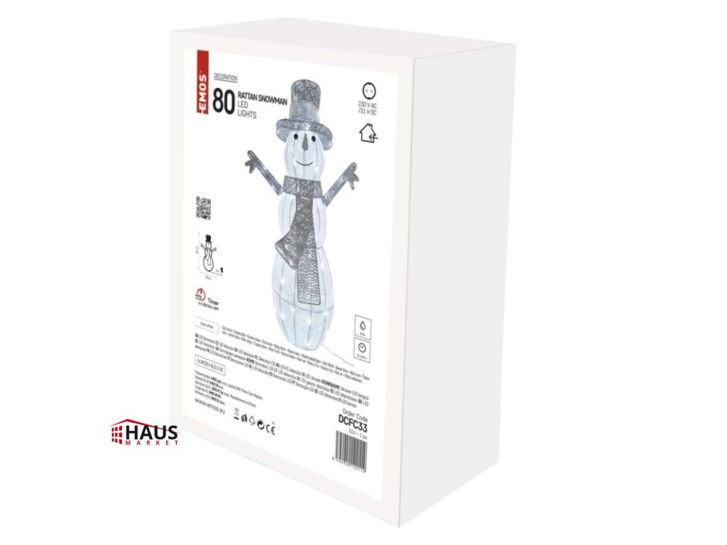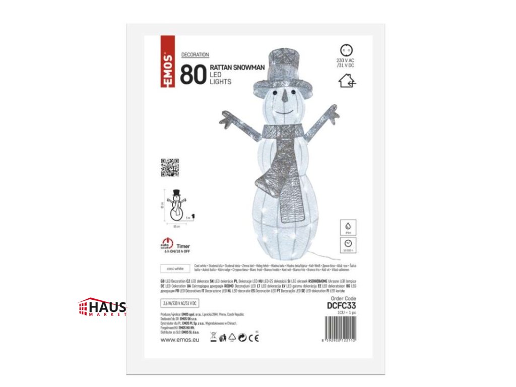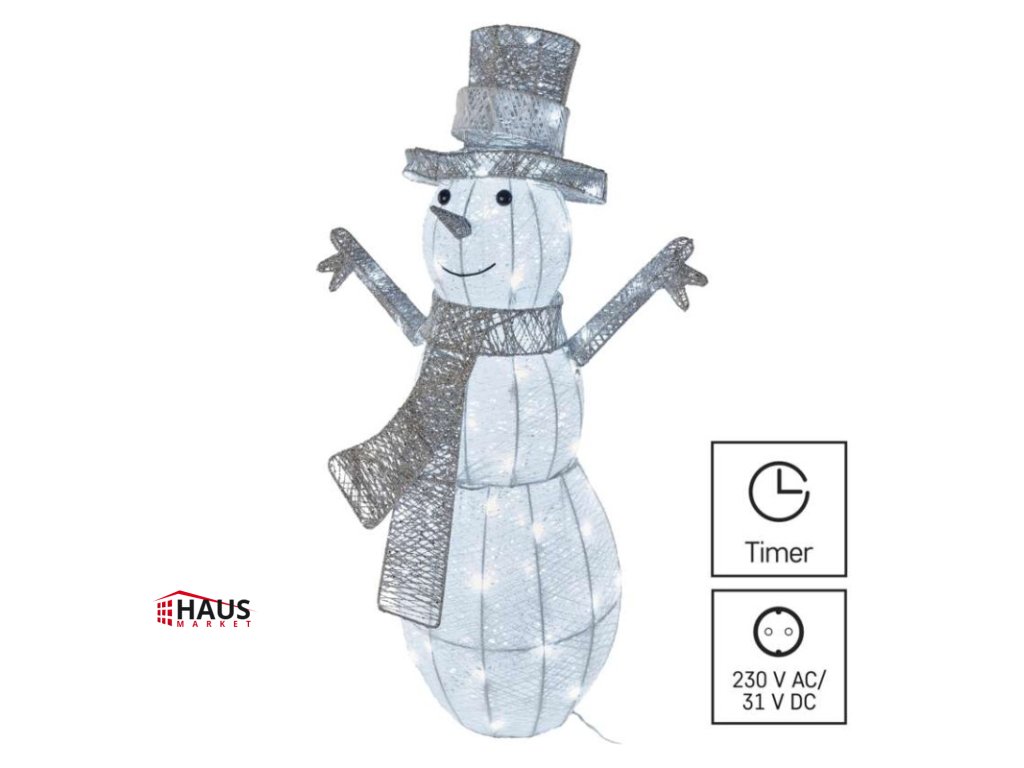časovač: áno|diaľkový ovládač: nie|dĺžka prívodu: 5 m|farba drôtu: neuvádza sa|farba svetla: studená biela|krytie: IP44|materiál: neuvádza sa|počet LED: 80|použitie: vonkajšie aj vnútorné|predajný obal: 1 ks, krabica|príkon: 3,6 W|produkt: snehuliak|rozmer: #|typ napájania: sieťový adaptér|vstupné napätie: 230 V AC|výstupné napätie: 31 V DC|záručná doba: 2 roky|zdroj svetla: LED|životnosť: 10 000 hodínDodatočné parametre