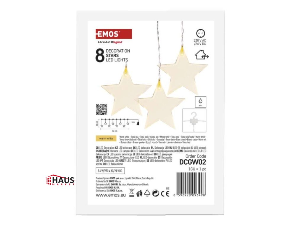 časovač: nie|diaľkový ovládač: nie|dĺžka prívodu: 5 m|farba drôtu: neuvádza sa|farba svetla: teplá biela|krytie: IP44|materiál: plast|počet LED: 8|použitie: vonkajšie aj vnútorné|predajný obal: 1 ks, krabica|príkon: 3,6 W|produkt: záves|rozmer: 84 × 45 cm|typ napájania: sieťový adaptér|vstupné napätie: 230 V AC|výstupné napätie: 24 V DC|záručná doba: 2 roky|zdroj svetla: LED|životnosť: 10 000 hodínDodatočné parametre