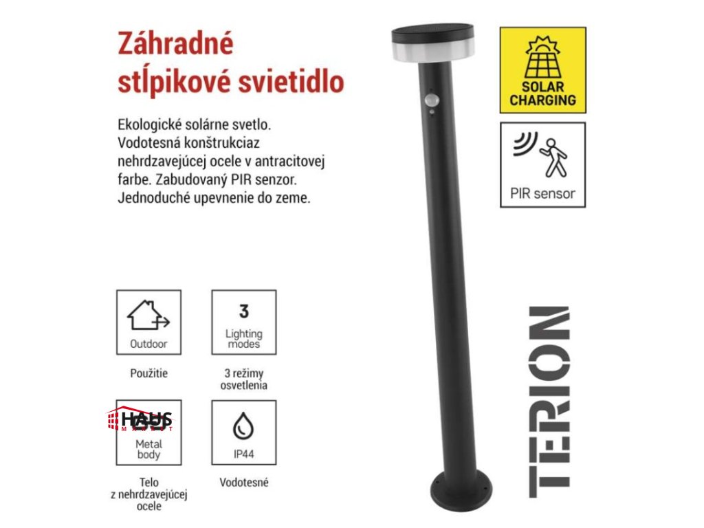 energetická trieda použitého zdroja svetla: –|farba: antracit|farba svetla: Teplá biela|fotovoltaický článok: 0,88 W|frekvencia: –|index podania farieb (CRI): > 80|kategória: CLASSIC|krytie: IP44|materiál: nehrdzavejúca oceľ|materiál difúzora: plast|napájanie: Li-Ion batéria 3,7 V/1 200 mAh|napätie: –|pätica (uchytenie žiarovky): –|predajný obal: 1 ks, krabička|príkon: 2 W|rada: TERION|rozmer: 125 × 125 × 805 mm|rozsah pracovnej teploty: 0 ~ +40 °C|Rozsah snímača PIR: 10 m|senzor PIR: áno|súmrakový spínač: áno|svetelný tok: max. 200 lm|teplota chromatičnosti: 3000 K|vstavaný vypínač: áno|zdroj svetla: LED|žiarovka súčasťou balenia: –|životnosť: 25 000 hDodatočné parametre