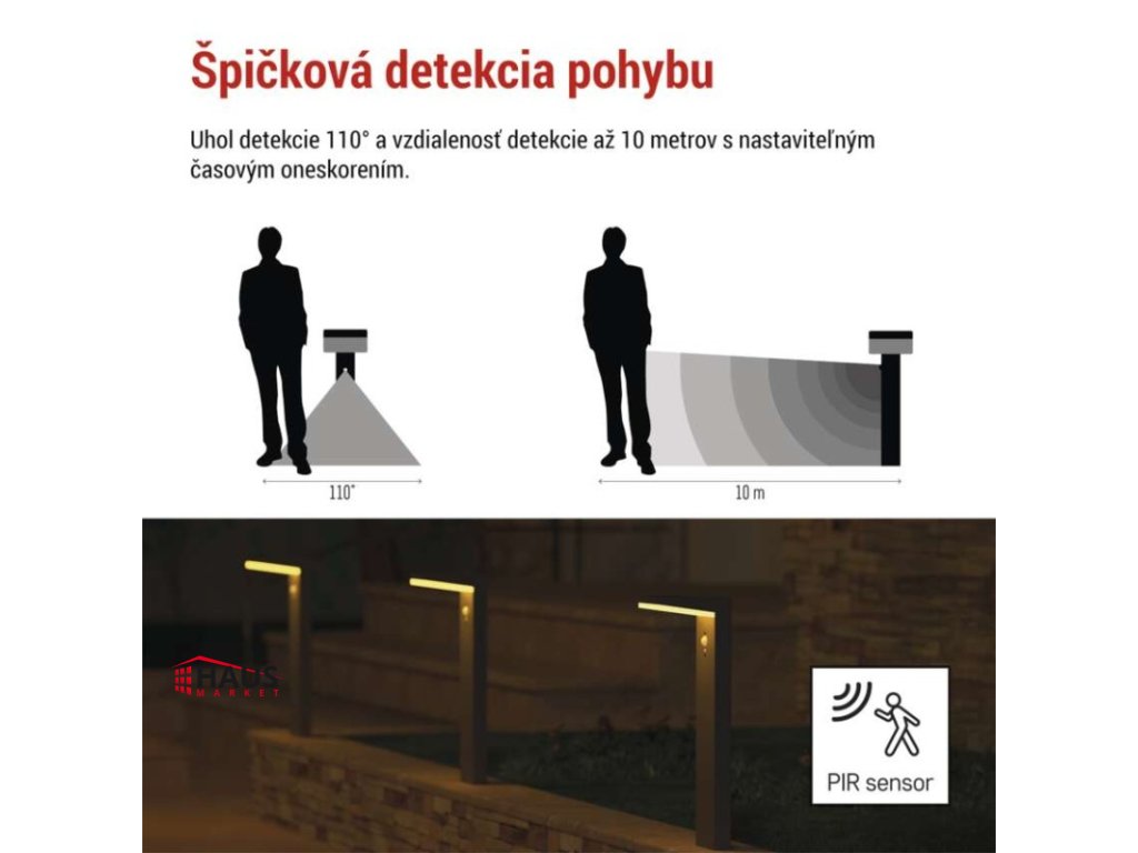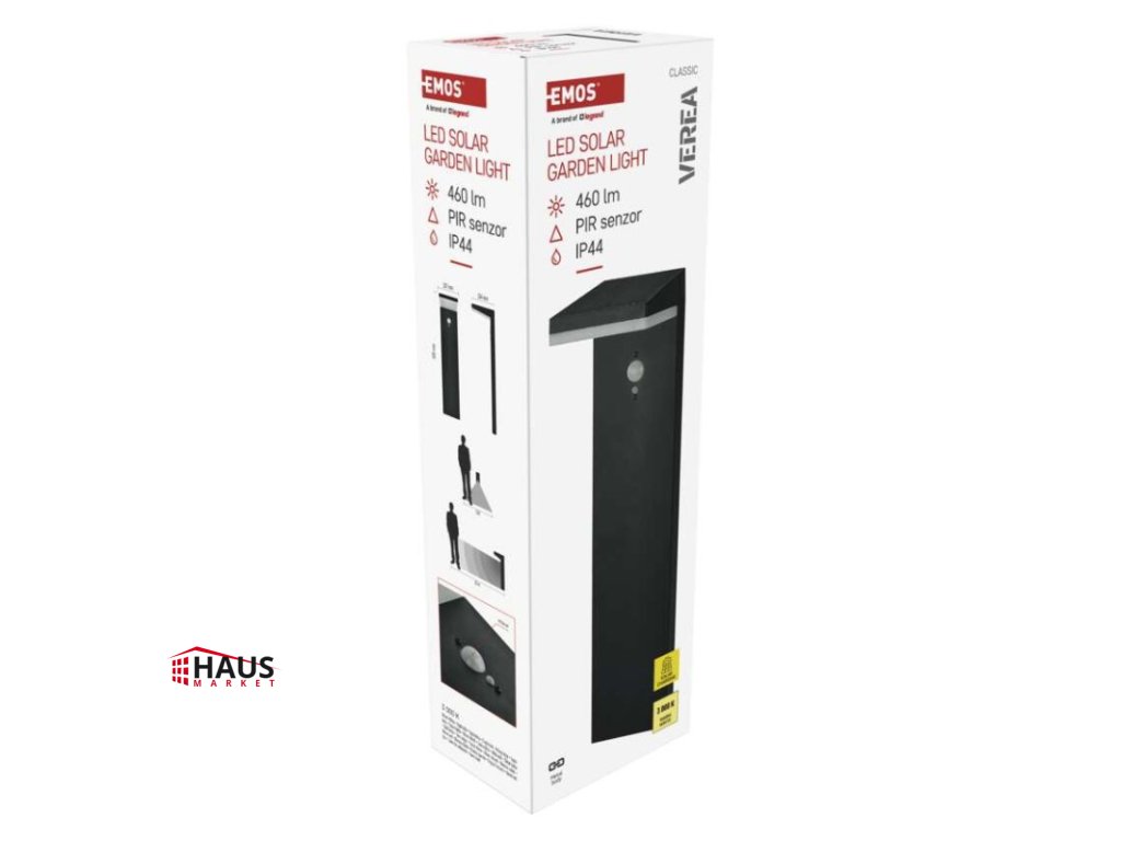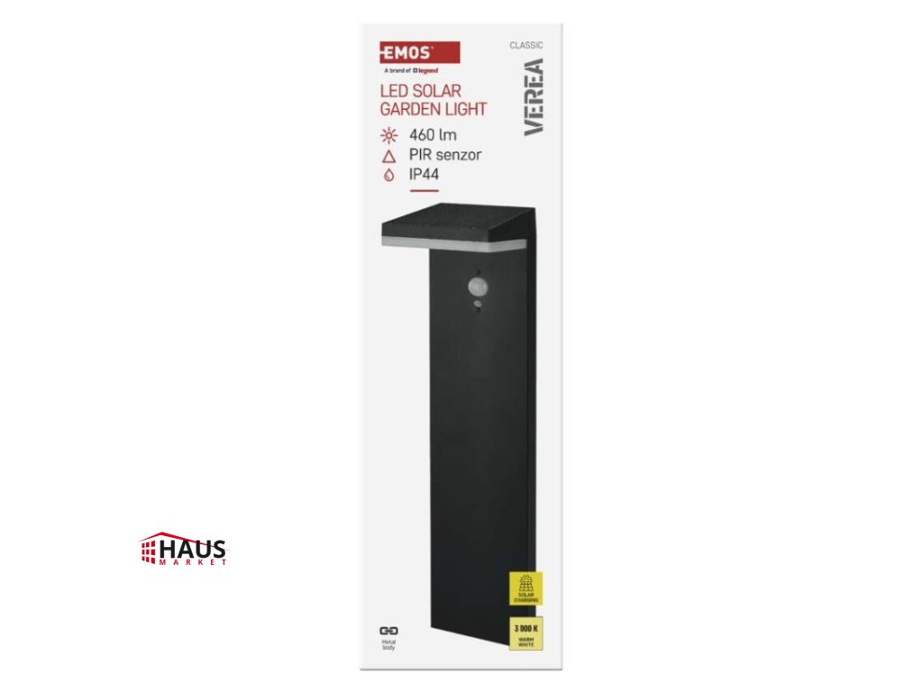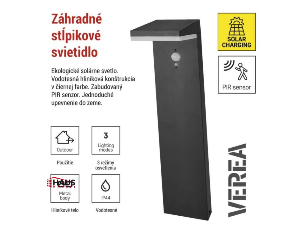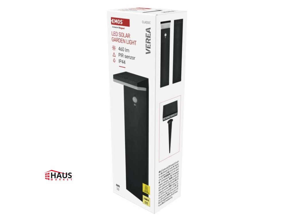 energetická trieda použitého zdroja svetla: –|farba: čierna|farba svetla: Teplá biela|fotovoltaický článok: 2,1 W|frekvencia: –|index podania farieb (CRI): > 80|kategória: CLASSIC|krytie: IP44|materiál: hliník (Al)|materiál difúzora: plast|napájanie: Li-Ion baterie 3,7 V/2 200 mAh|napätie: –|pätica (uchytenie žiarovky): –|predajný obal: 1 ks, krabička|príkon: 4,4 W|rada: VEREA|rozmer: 154 × 107 × 500 mm|rozsah pracovnej teploty: 0 ~ +40 °C|Rozsah snímača PIR: 10 m|senzor PIR: áno|súmrakový spínač: áno|svetelný tok: max. 460 lm|teplota chromatičnosti: 3000 K|vstavaný vypínač: áno|zdroj svetla: LED|žiarovka súčasťou balenia: –|životnosť: 25 000 hDodatočné parametre
