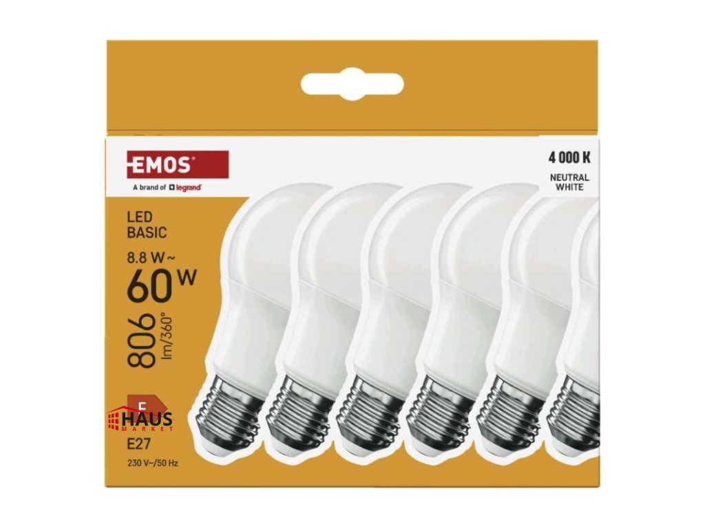 energetická trieda: F|farba svetla: neutrálna biela|index podania farieb (CRI): Ra >80|kompatibilita: –|náhrada za žiarovku: 60 W|napätie: 230 V~/50 Hz|notifikácie do mobilnej aplikácie: nie|ovládanie hlasovými asistentmi: nie|pätica (uchytenie žiarovky): E27|počet čipov: neuvádza sa|počet spínacích cyklov: 20 000|podporované OS: –|predajný obal: 6 ks, krabička|prenosová frekvencia: –|príkon: 8,8 W|protokol: –|rada: BASIC|rozmer: 60 × 60 × 110 (max.) mm|stmievateľná: nie|svetelná účinnosť: 92 lm/W|svetelný tok: 806 lm|technológia: LED|teplota chromatičnosti: 4 000 K|tvar: A60|typ čipov: SMD|účinník: 0.50|uhol vyžarovania: 200°|záručná doba: 2 roky|životnosť: 20 000 hodínDodatočné parametre