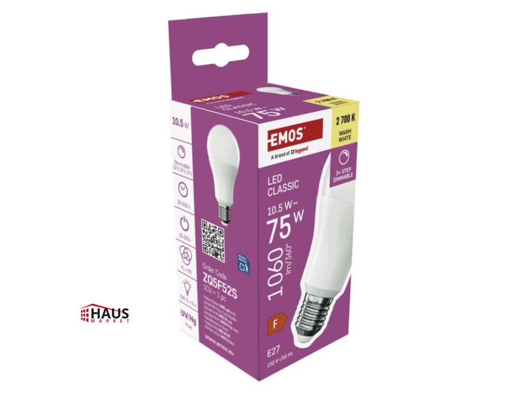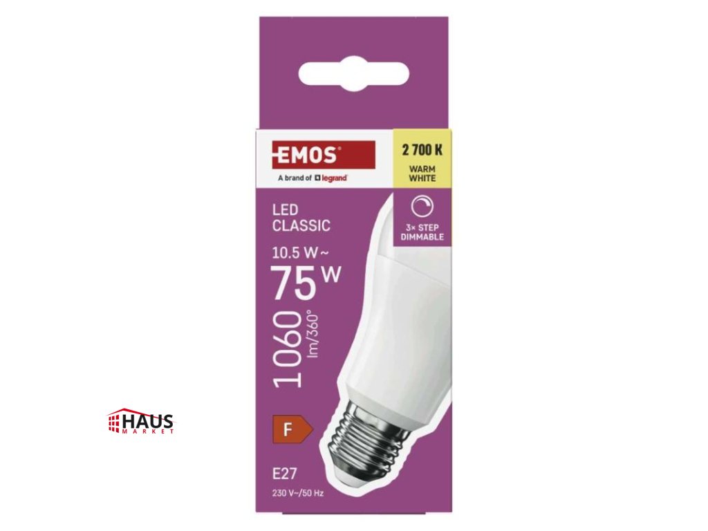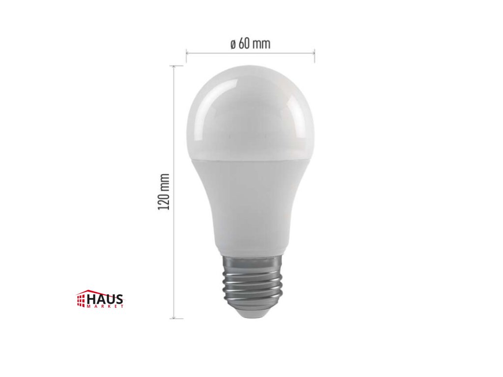 energetická trieda: F|farba svetla: teplá biela|index podania farieb (CRI): Ra >80|kompatibilita: –|náhrada za žiarovku: 75 W|napätie: 230 V~/50 Hz|notifikácie do mobilnej aplikácie: –|ovládanie hlasovými asistentmi: –|pätica (uchytenie žiarovky): E27|počet čipov: 4|počet spínacích cyklov: 25 000|podporované OS: –|predajný obal: 1 ks, krabička|prenosová frekvencia: –|príkon: 10,5 W|protokol: –|rada: CLASSIC|rozmer: 120 × 60 × 60 mm|stmievateľná: áno|svetelná účinnosť: 101 lm/W|svetelný tok: 1 060 lm|technológia: LED|teplota chromatičnosti: 2 700 K|tvar: A60|typ čipov: SMD|účinník: 0,53|uhol vyžarovania: 160°|záručná doba: 3 roky|životnosť: 30 000 hodínDodatočné parametre