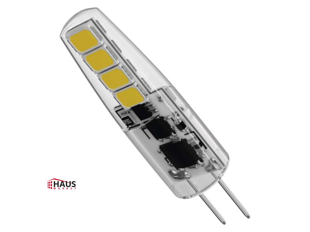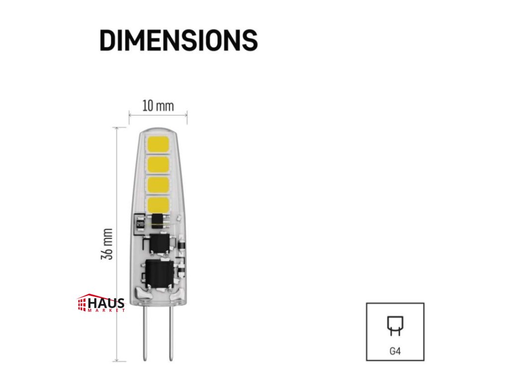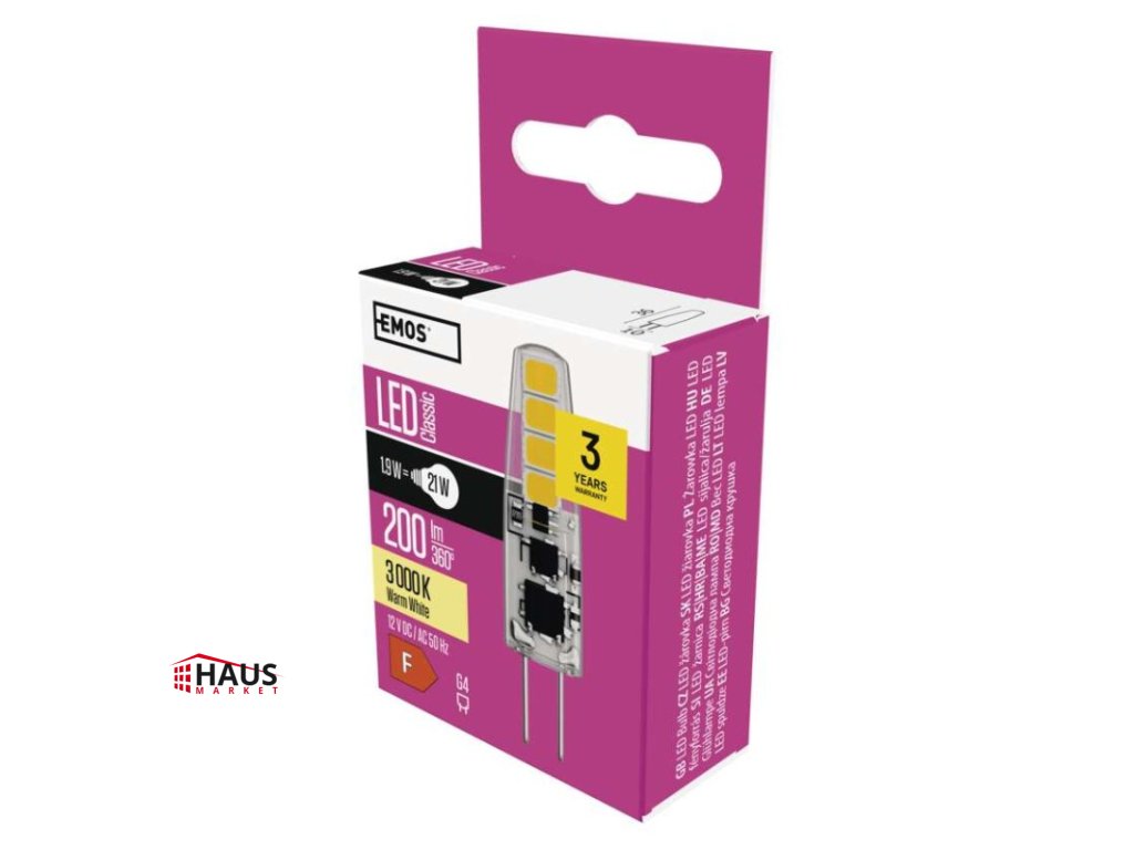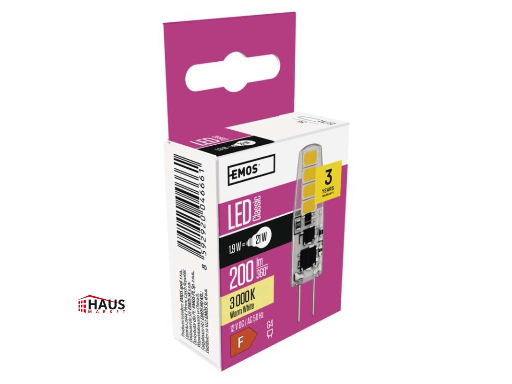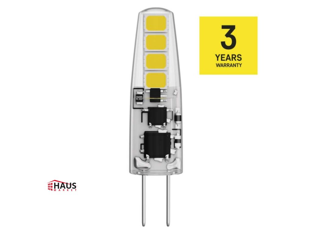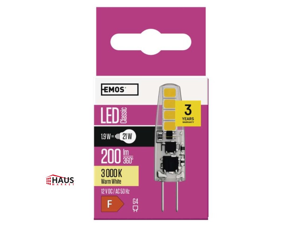 #: #|energetická trieda: F|farba svetla: teplá biela|index podania farieb (CRI): Ra >80|kompatibilita: –|náhrada za žiarovku: 21 W|napätie: 12 V|notifikácie do mobilnej aplikácie: –|ovládanie hlasovými asistentmi: –|pätica (uchytenie žiarovky): G4|počet čipov: neuvádza sa|počet spínacích cyklov: 25 000|podporované OS: –|predajný obal: 1 ks, krabička|prenosová frekvencia: –|príkon: 1,9 W|protokol: –|rada: CLASSIC|rozmer: 36 × 10 × 10 mm|stmievateľná: nie|svetelná účinnosť: 105 lm/W|svetelný tok: 200 lm|technológia: LED|teplota chromatičnosti: 3 000 K|tvar: JC|typ čipov: SMD|účinník: 0.71|uhol vyžarovania: 300°|záručná doba: 3 roky|životnosť: 30 000 hodínDodatočné parametre