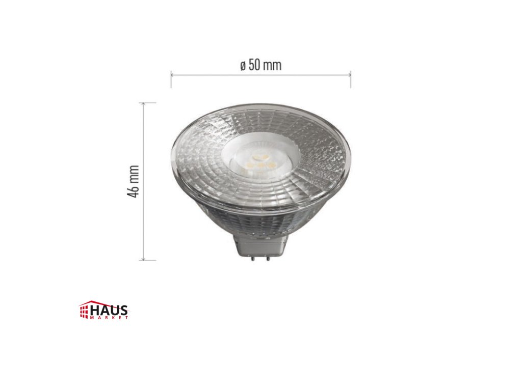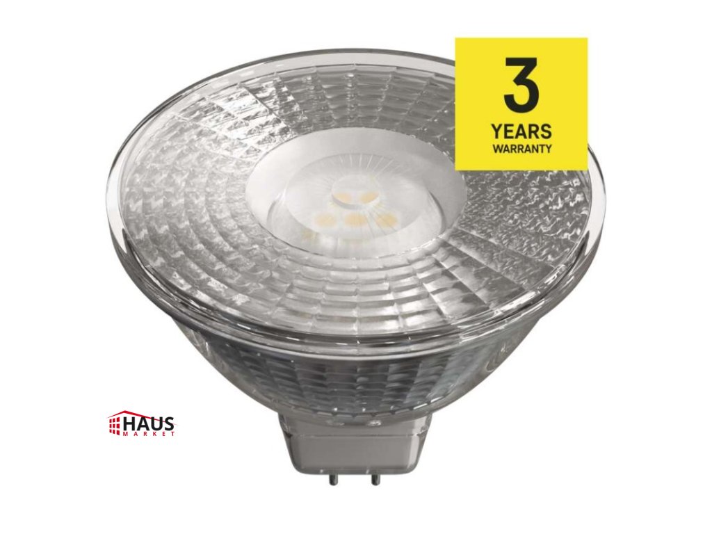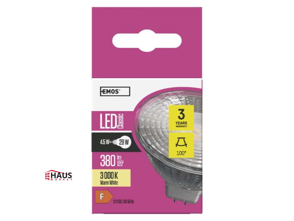 energetická trieda: F|farba svetla: teplá biela|index podania farieb (CRI): Ra >80|kompatibilita: –|náhrada za žiarovku: 28 W|napätie: 12 V|notifikácie do mobilnej aplikácie: –|ovládanie hlasovými asistentmi: –|pätica (uchytenie žiarovky): GU5,3|počet čipov: neuvádza sa|počet spínacích cyklov: 25 000|podporované OS: –|predajný obal: 1 ks, krabička|prenosová frekvencia: –|príkon: 4,5 W|protokol: –|rada: CLASSIC|rozmer: 46 × 50 × 50 mm|stmievateľná: nie|svetelná účinnosť: 99 lm/W|svetelný tok: 380 lm|technológia: LED|teplota chromatičnosti: 3 000 K|tvar: MR16|typ čipov: SMD|účinník: 0.72|uhol vyžarovania: 100°|záručná doba: 3 roky|životnosť: 30 000 hodínDodatočné parametre
