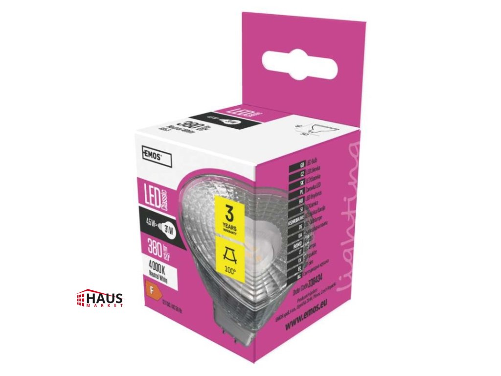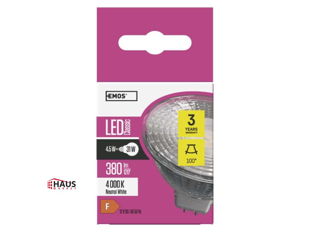 energetická trieda: F|farba svetla: neutrálna biela|index podania farieb (CRI): Ra >80|kompatibilita: –|náhrada za žiarovku: 31 W|napätie: 12 V|notifikácie do mobilnej aplikácie: –|ovládanie hlasovými asistentmi: –|pätica (uchytenie žiarovky): GU5,3|počet čipov: neuvádza sa|počet spínacích cyklov: 25 000|podporované OS: –|predajný obal: 1 ks, krabička|prenosová frekvencia: –|príkon: 4,5 W|protokol: –|rada: CLASSIC|rozmer: 46 × 50 × 50 mm|stmievateľná: nie|svetelná účinnosť: 99 lm/W|svetelný tok: 380 lm|technológia: LED|teplota chromatičnosti: 4 000 K|tvar: MR16|typ čipov: SMD|účinník: 0.71|uhol vyžarovania: 100°|záručná doba: 3 roky|životnosť: 30 000 hodínDodatočné parametre